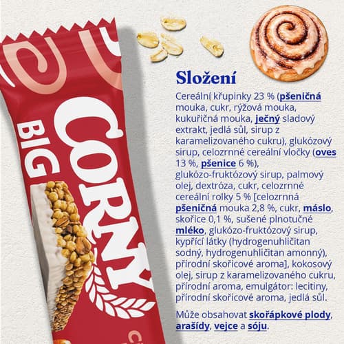 Cereální křupinky 23 % (PŠENIČNÁ mouka, cukr, rýžová mouka, kukuřičná mouka, JEČNÝ sladový extrakt, jedlá sůl, sirup z karamelizovaného cukru), glukózový sirup, celozrnné cereální vločky (OVES 13 %, PŠENICE 6 %), glukózo-fruktózový sirup, palmový olej, dextróza, cukr, celozrnné cereální rolky 5 % [celozrnná PŠENIČNÁ mouka 2,8 %, cukr, MÁSLO, skořice 0,1 %, sušené plnotučné MLÉKO, glukózo-fruktózový sirup, kypřící látky (hydrogenuhličitan sodný, hydrogenuhličitan amonný), přírodní skořicové aroma], kokosový olej, sirup z karamelizovaného cukru, přírodní aroma, emulgátor: lecitiny, přírodní skořicové aroma, jedlá sůl. Může obsahovat SKOŘÁPKOVÉ PLODY, ARAŠÍDY, VEJCE a SÓJU.
