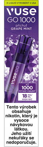 Vuse GO jednorázová elektronická cigareta s osvěžující příchutí černých hroznů a chladivé máty. Nabízí až 1000 potahů, 18 mg/ml nikotinu a 2 ml e-liquidu. Díky regulaci intenzity potahu si zážitek přizpůsobíte, navíc se nemusí nabíjet. Tento produkt z EU je určen pouze pro dospělé uživatele starší 18 let.