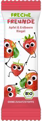 BIO cereální tyčinka Freche Freunde kombinuje chuť jablka a jahody s ovesnými vločkami.