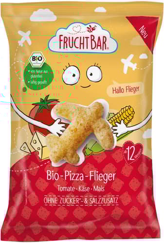 FruchtBar BIO kukuřičné křupky ve tvaru letadel s rajčetem, mrkví a sýrem nabízejí chuť inspirovanou pizzou.