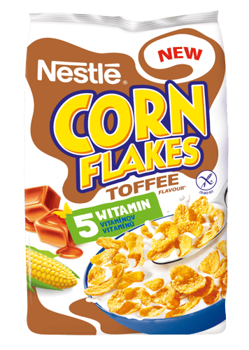 Křupavé kukuřičné lupínky v nové příchuti toffee. Obsahují pět vitamínů a jsou bez lepku.