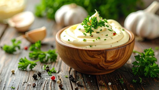 Složení: voda, slunečnicový olej 35 %, kvasný ocet lihový, cukr, česnek (5 %), sušená syrovátka (mléko), modifikovaný škrob, jedlá sůl, koření (obsahuje hořčici), pažitka, kyselina (kyselina citronová), zahušťovadlo (xanthan, guma guar), přírodní aroma.