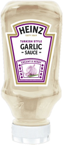 Heinz Omáčka Česneková je krémová omáčka s výraznou česnekovou chutí v praktické lahvi.