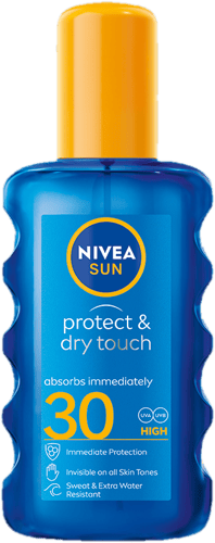 Nivea Sun Protect & Dry sprej SPF 30 poskytuje okamžitou ochranu před slunečním zářením bez viditelných bílých stop. Průhledné, nemastné složení se rychle vstřebává a je vhodné i při sportu. Sprej je voděodolný a odolný vůči potu, takže se hodí na pláž i aktivní den venku. Kožní snášenlivost je dermatologicky prokázána.