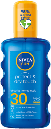 Španělsko,Nivea Sun Protect & Dry sprej SPF 30 poskytuje okamžitou ochranu před slunečním zářením bez viditelných bílých stop. Průhledné, nemastné složení se rychle vstřebává a je vhodné i při sportu. Sprej je voděodolný a odolný vůči potu, takže se hodí na pláž i aktivní den venku. Kožní snášenlivost je dermatologicky prokázána.