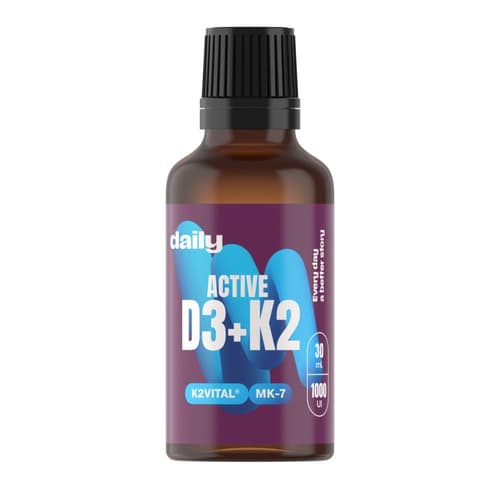 Doplněk stravy. Vitamin D3 je známý jako „sluneční vitamín“, protože si ho tělo vytváří při vystavení pokožky slunci. V našich podmínkách je ale jeho nedostatek častý, zvlášť v zimě. Vitamin K2 je přirozeným partnerem D3, protože pomáhá směrovat vápník tam, kam má, a to do kostí a ne do cév. Active D3 + K2 spojuje obě látky v bio MCT oleji z kokosu pro lepší vstřebávání. Vitamin D přispívá k normálnímu stavu kostí, zubů a svalů, podporuje správnou funkci imunitního systému a normální vstřebávání vápníku a fosforu. Vitamin K přispívá k udržení normálního stavu kostí a podporuje správnou srážlivost krve. Pro koho je Active D3 + K2 od Daily vhodný? Pro každého, kdo má omezený přístup ke slunečnímu záření, pro osoby, které chtějí podpořit zdraví kostí a zubů, pro ty, kdo doplňují vápník (K2 pomáhá s jeho správným využitím) a pro vegetariány (produkt neobsahuje želatinu ani živočišné složky). Nepřekračujte doporučené denní dávkování. Uchovávejte mimo dosah dětí. Doplňky stravy nejsou náhradou pestré a vyvážené stravy. Balení obsahuje 30 ml.