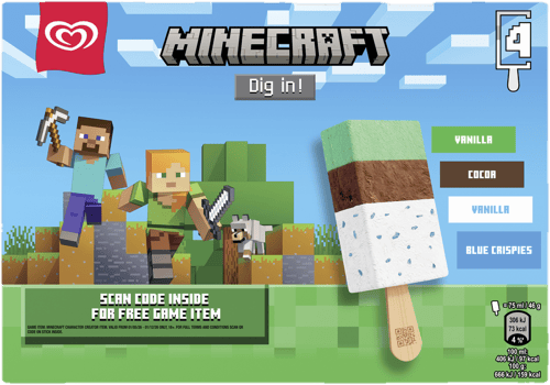 Polsko,Zmrzlina Algida inspirovaná světem Minecraftu v praktickém multipacku. Každý kus má tři barevné vrstvy a křupavý prvek.