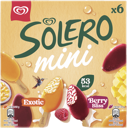 Polsko,Solero Mini nabízí kombinaci jemné vanilkové zmrzliny a ovocného sorbetu v praktickém mini formátu. Jedna porce má méně než 100 kalorií.