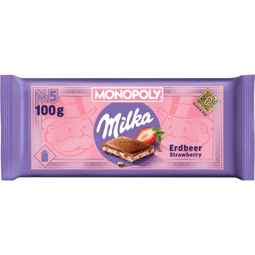 Mléčná čokoláda ze 100% alpského mléka je plněná jogurtovou náplní s jahodovou příchutí.
