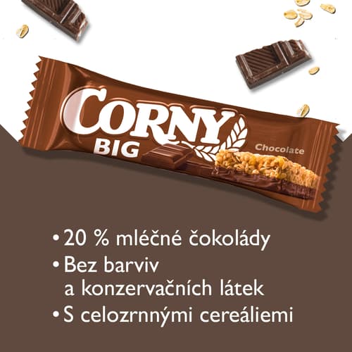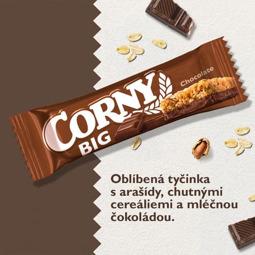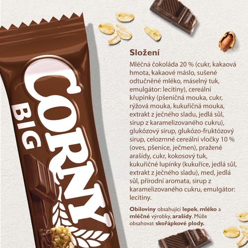 Corny Big je cereální tyčinka v mléčné čokoládě s křupavými arašídy, která zažene hlad i chuť na něco sladkého. Obsahuje celozrnné cereální vločky, které z ní dělají ideální svačinku mezi jídly.