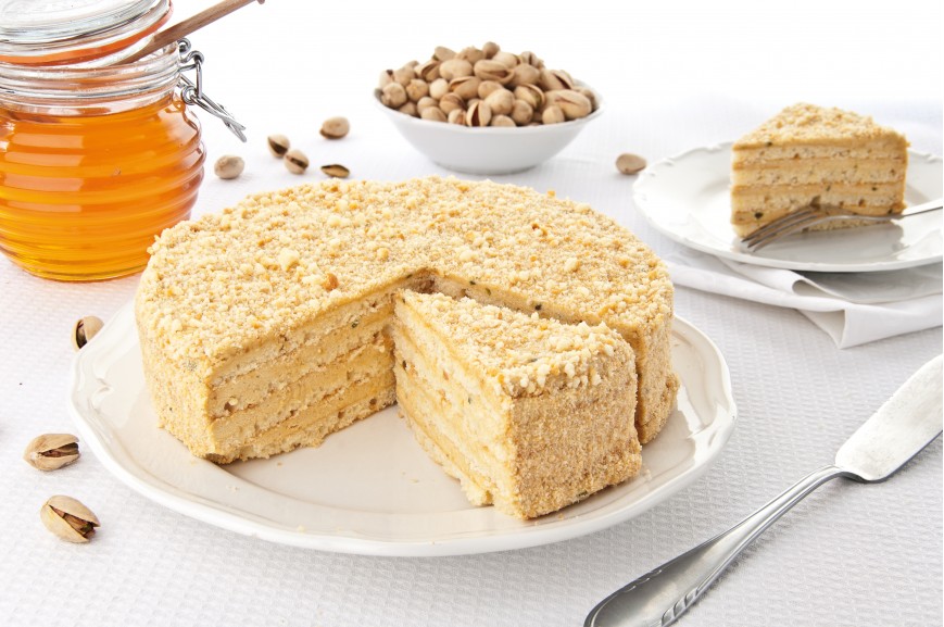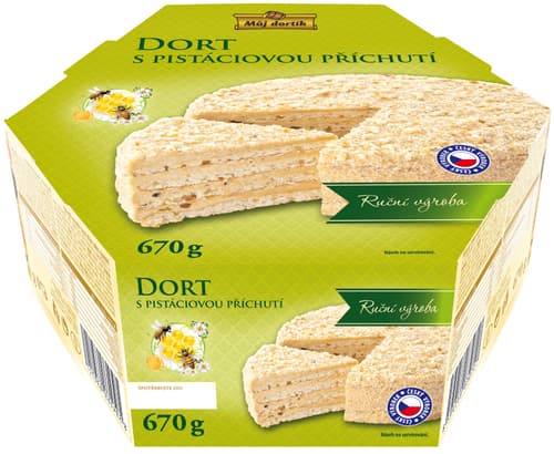 Piškotový korpus v kombinaci s jemným pistáciovým krémem.