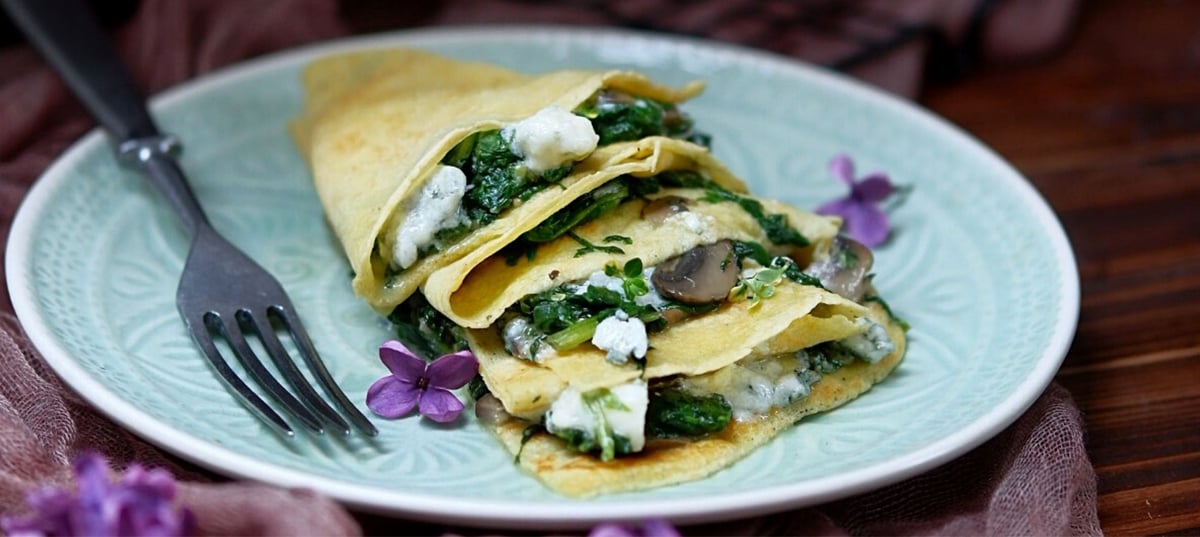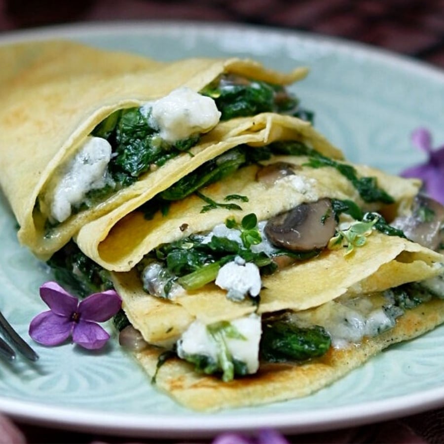 Layer a portion of the spinach mixture and pieces of Roquefort on each pancake. Fold into quarters and serve.