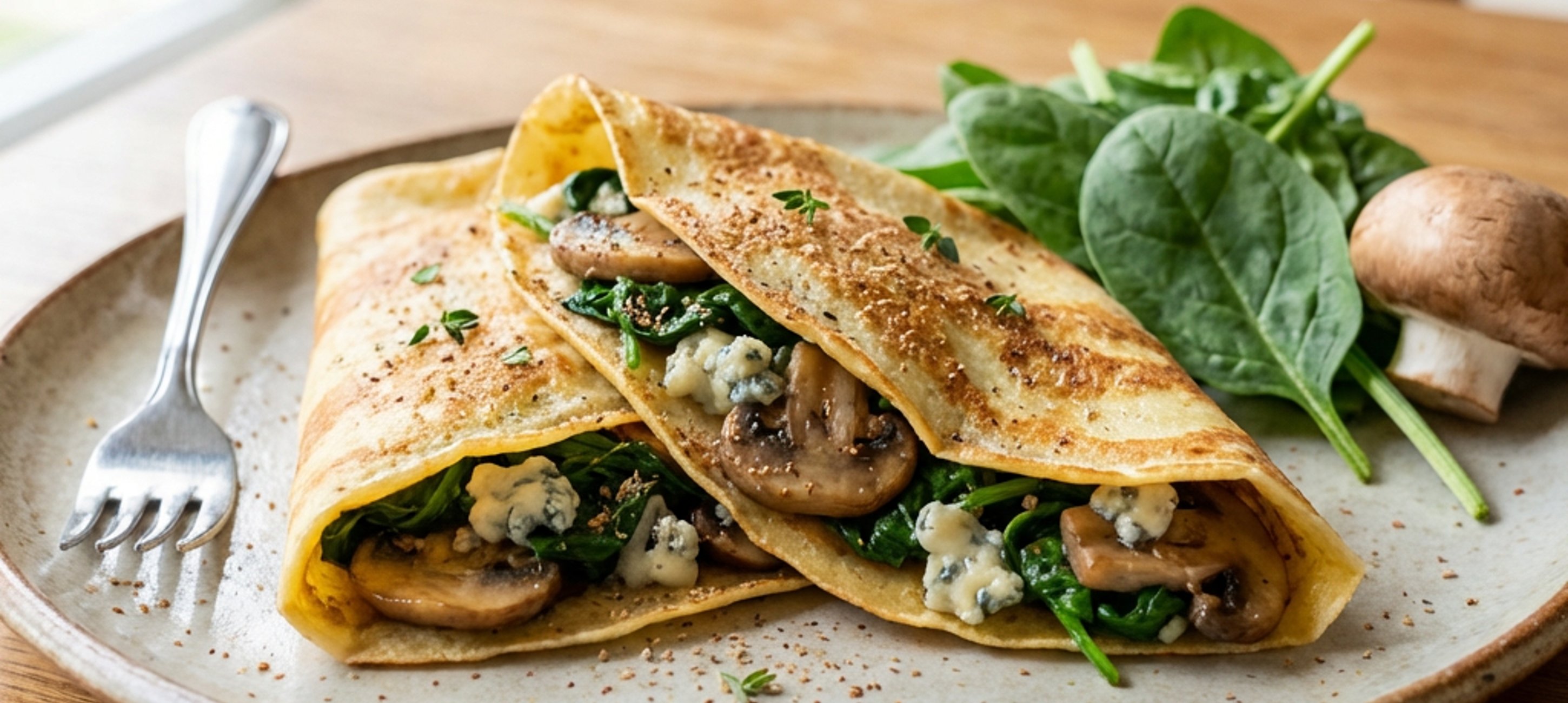 - 3Na každou palačinku navrstvíme část špenátové směsi a kousky roquefortu. Přeložíme na čtvrtiny a podáváme.