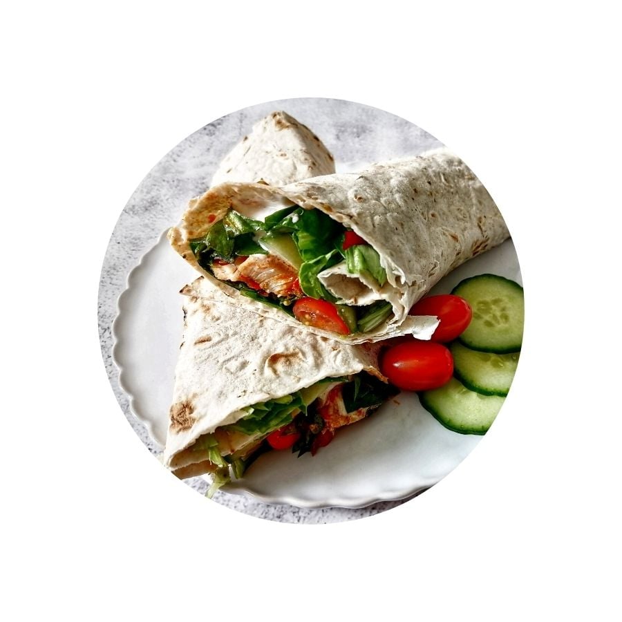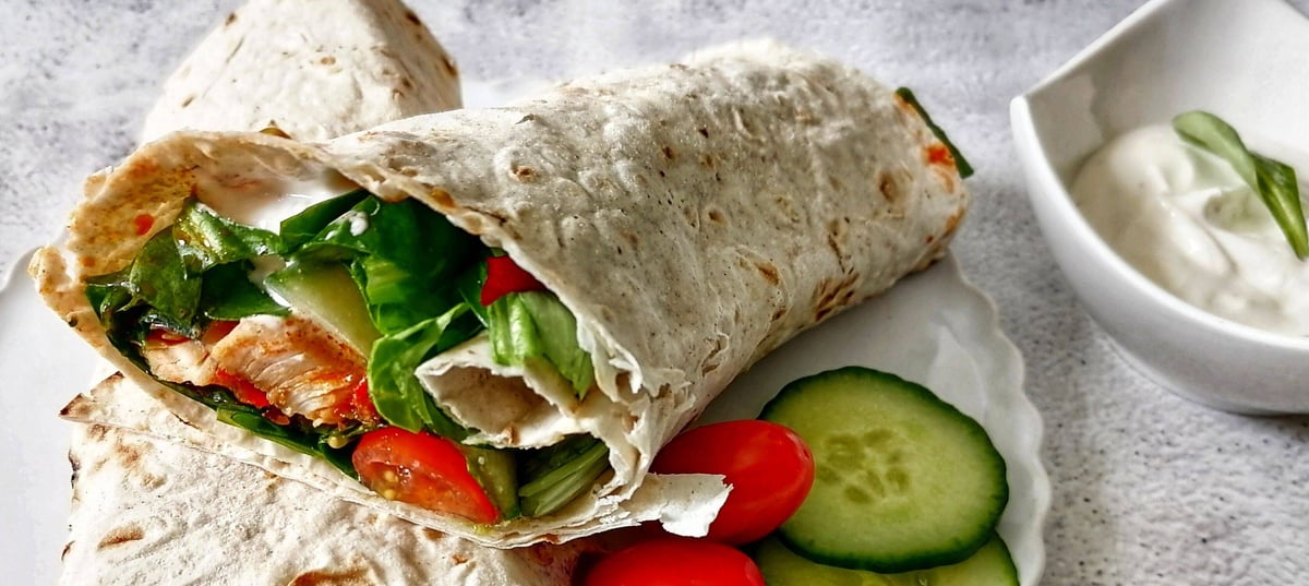 - 7Lavash placku přepulte a na každou půlku naneste po celé její šířce (v pruzích vedle sebe) polníček, kuřecí směs, rajčátka, okurku a dip.