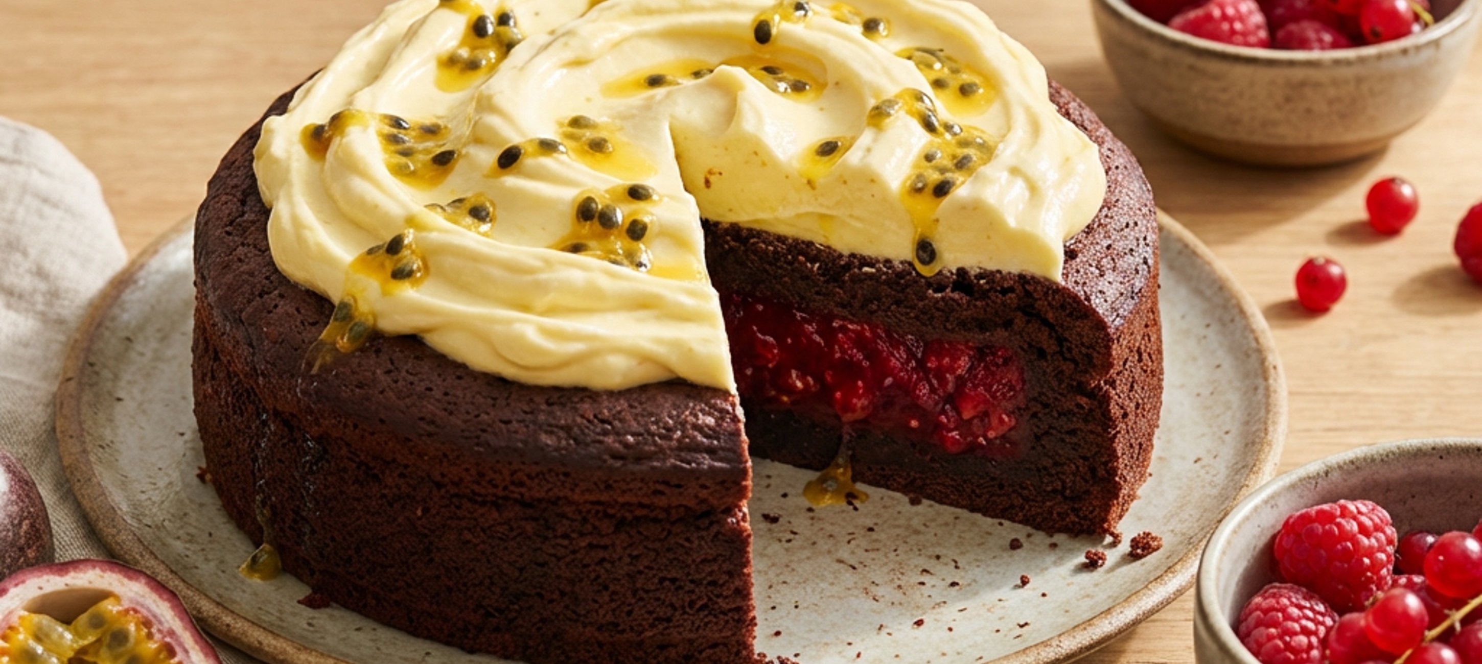 - 1Korpus jednou prořízněte a na spodní díl naneste lžící ovocné želé a rozetřete po celém povrchu. Přiklopte vrchním dílem a na ten rozetřete našlehaným krémem a dozdobte dužinou z mučenky.