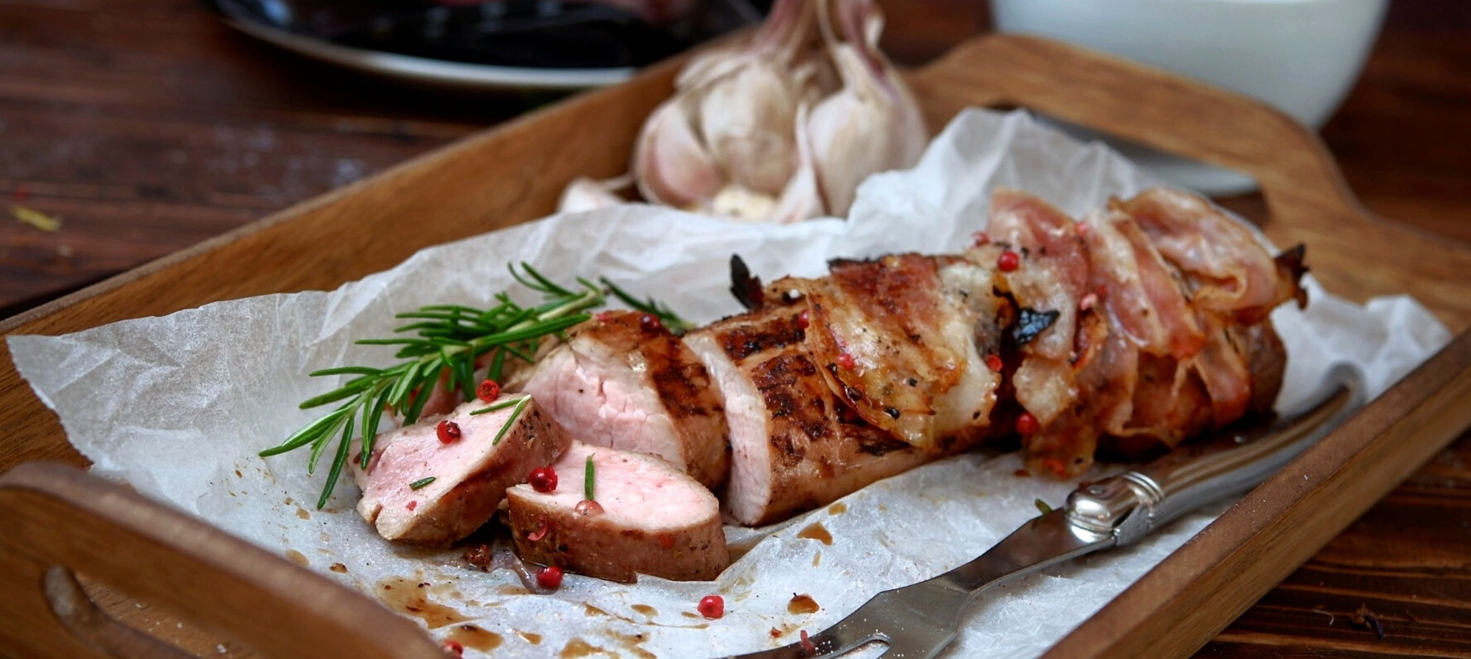 - 3Remove the tenderloin from the marinade and wrap it in slices of bacon. Heat the grill to 240 degrees and grill each side for 5 minutes. Remember the sides of the tenderloin as well. Adjust the time according to the thickness of the meat. Properly grilled tenderloin should remain pink inside.