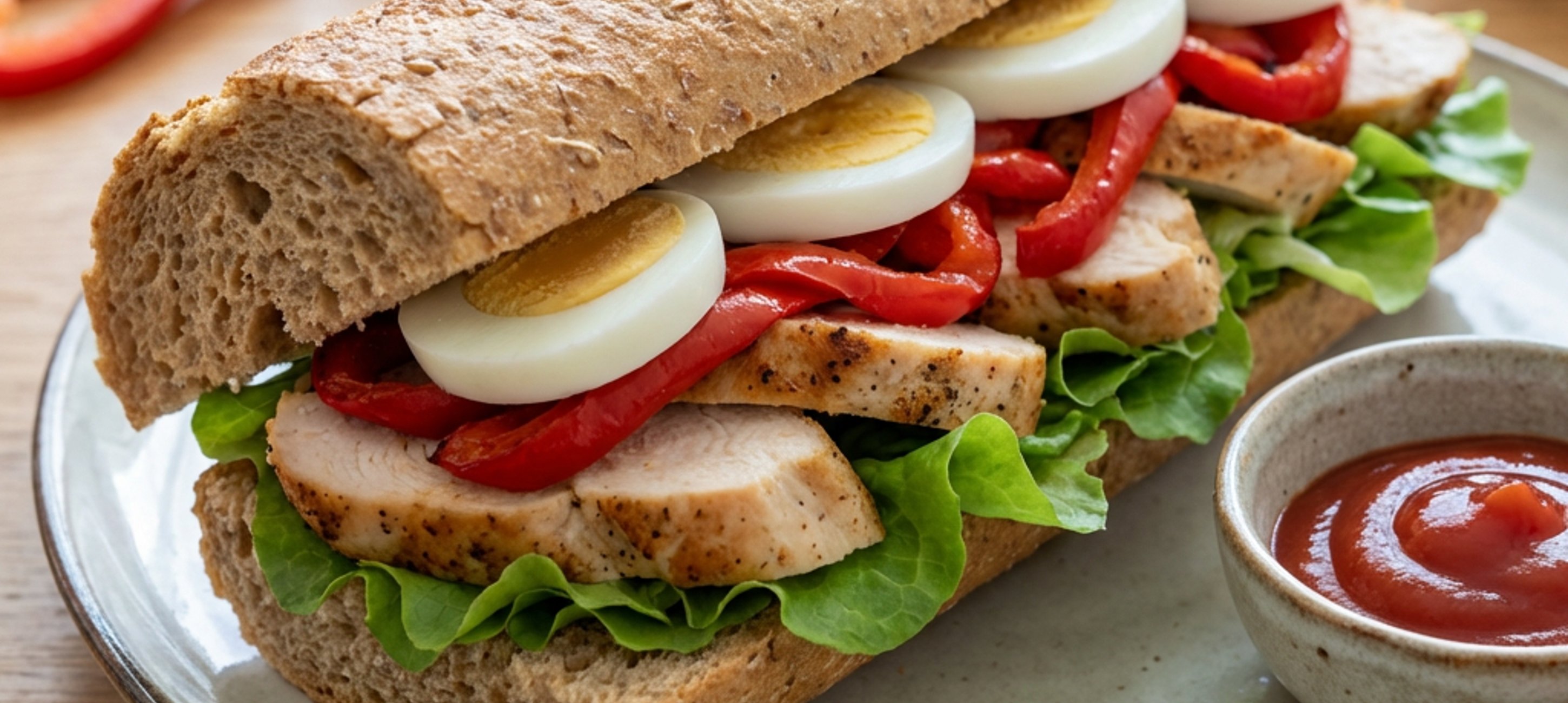 - 4Kompletace: Bagety prořízneme a namažeme kečupem. Vložíme listy salátu, na něj plátky kuřecích prsou, na kolečka nakrájené vejce a kousky pečených paprik.