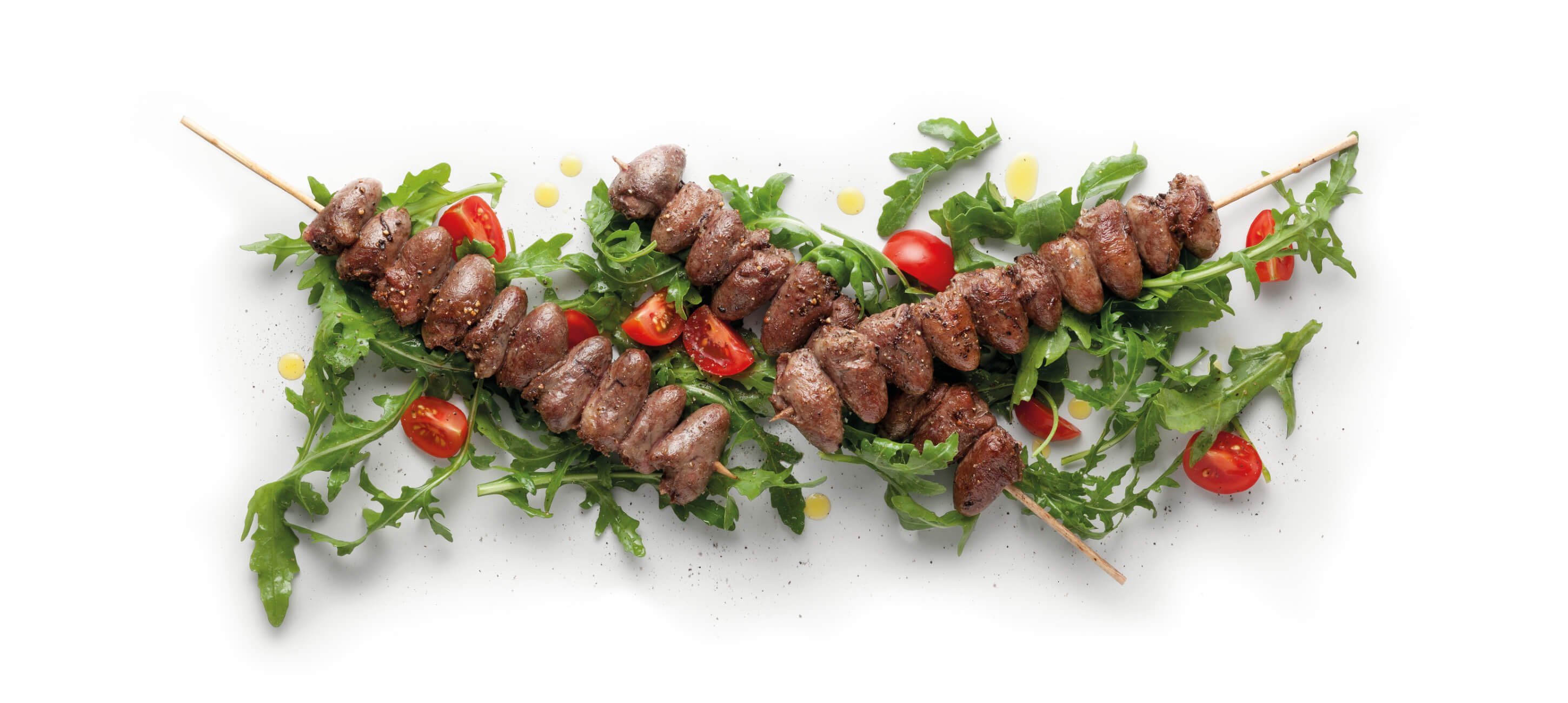 - 3Špejle namočíme na 10 minut do studené vody. Odleželá srdíčka napícháme na špejle. Položíme je na rozpálený gril a grilujeme 2-2,5 minuty z každé strany.
