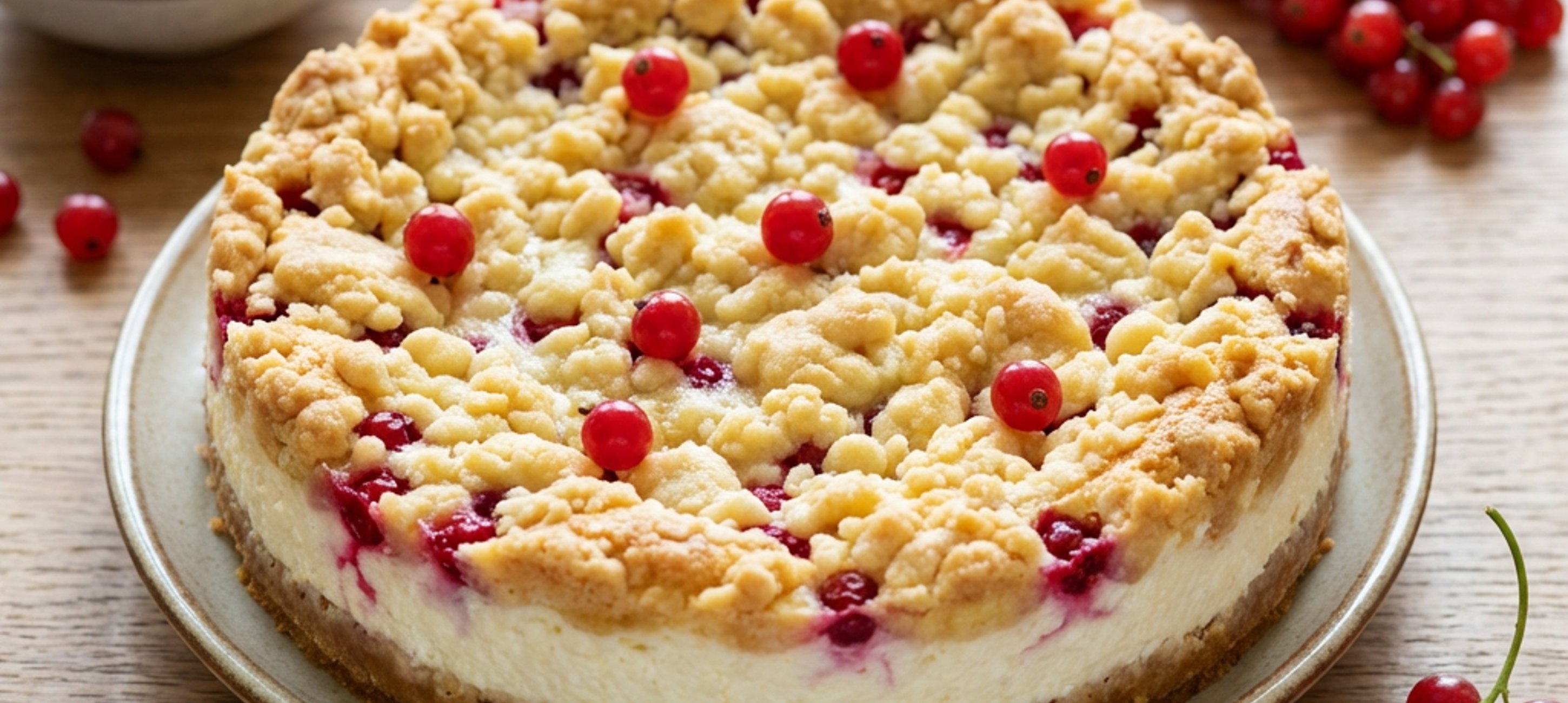 - 1Troubu předehřejte na 180˚ horní dolní ohřev. Koláčovou formu vymažte máslem a vysypejte moukou. Dvě třetiny drobenky lehce vmačkejte na dno formy a vytvořte nízký okraj. Na těsto naneste tvarohovou směs, poklaďte otrhaný, opraný a okapaný rybíz a navrch navrstvěte zbytek drobenky.