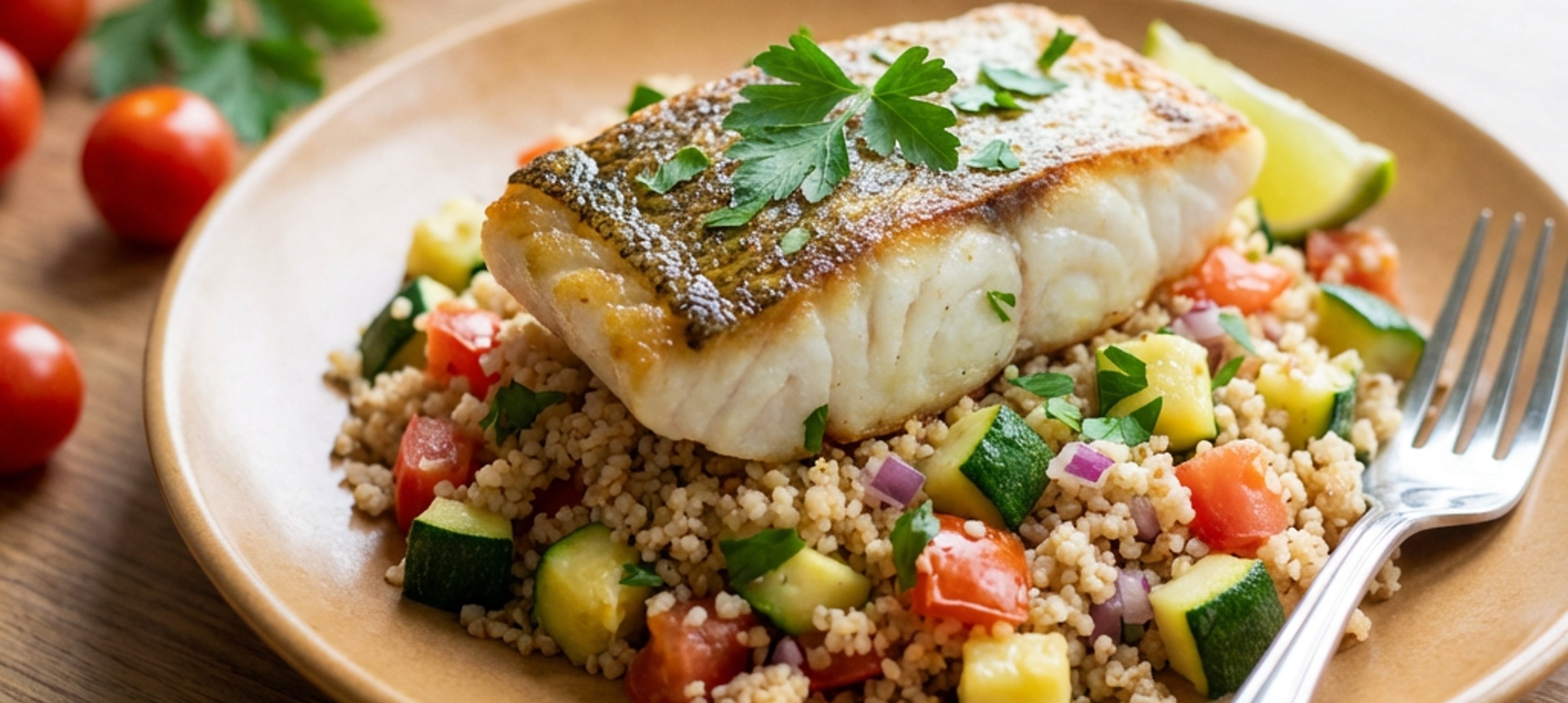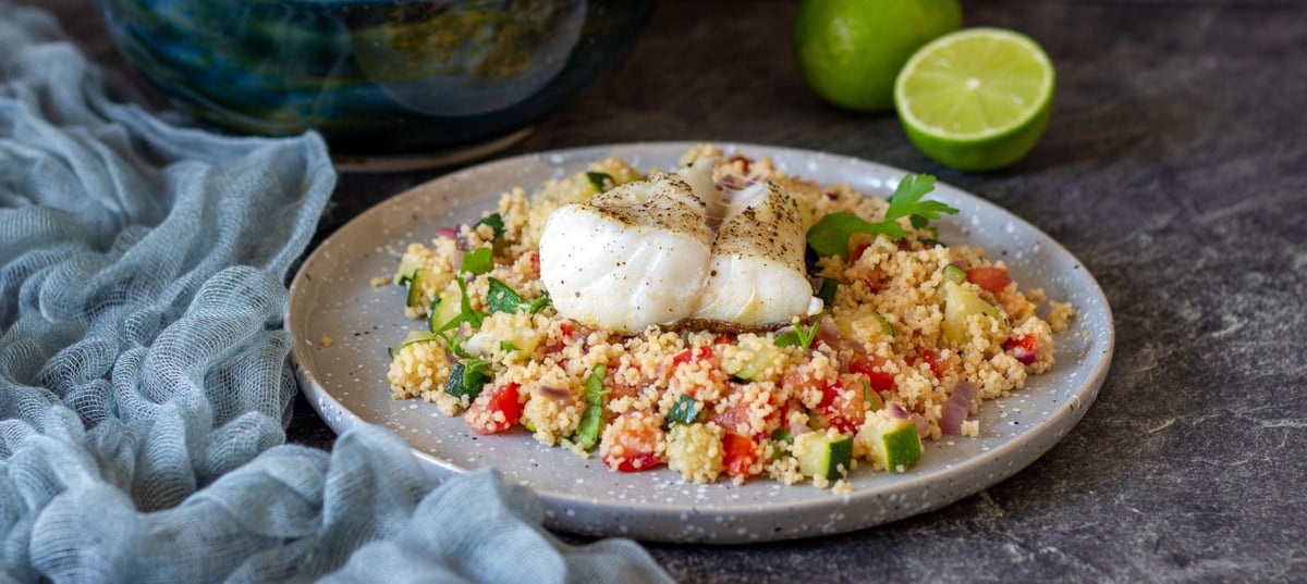 - 3Na pánvi si rozehřejeme lžíci oleje a cibuli s cuketou a česnekem krátce orestujeme. Následně smícháme s kuskusem. Přidáme rajče a nakrájenou petrželku. Dochutíme šťávou z limetky. Pokud je potřeba, dosolíme.