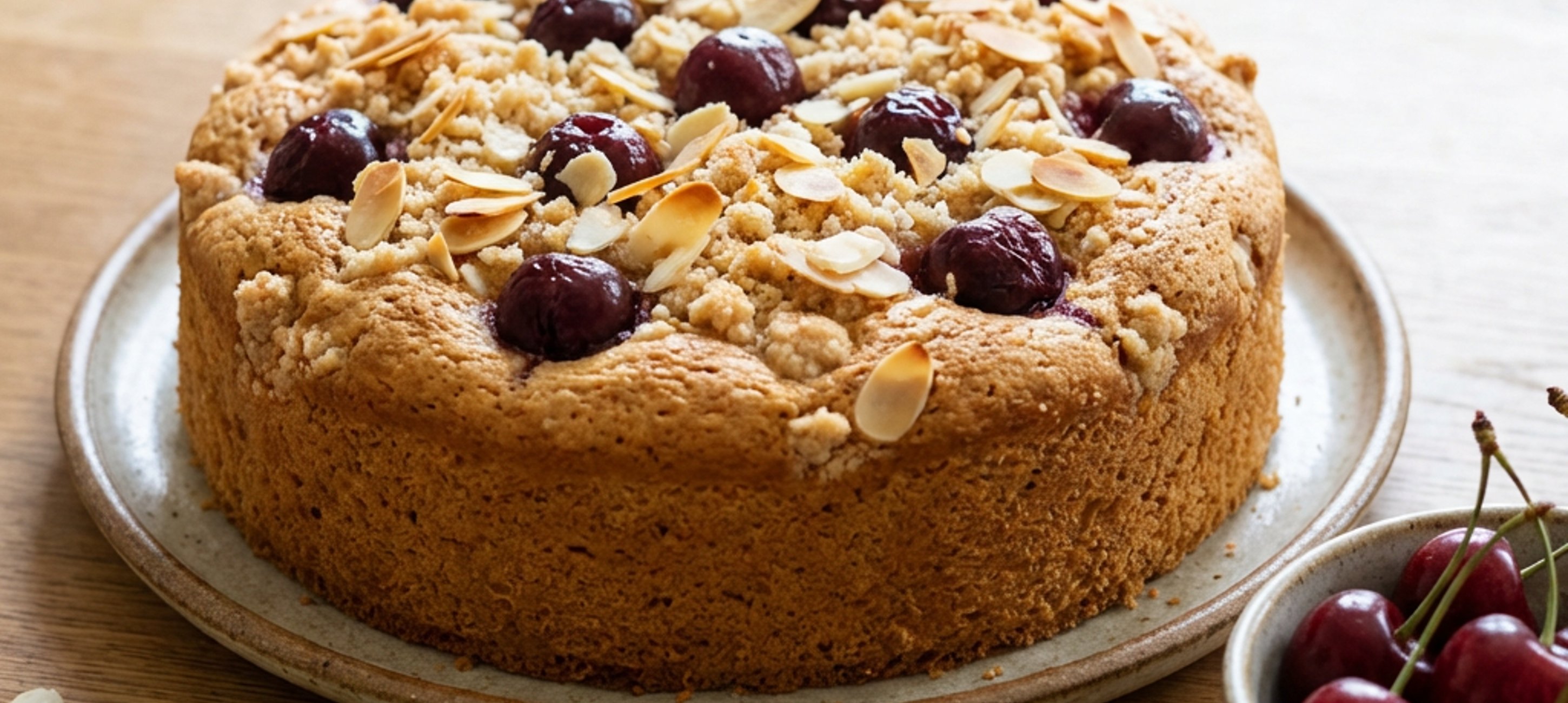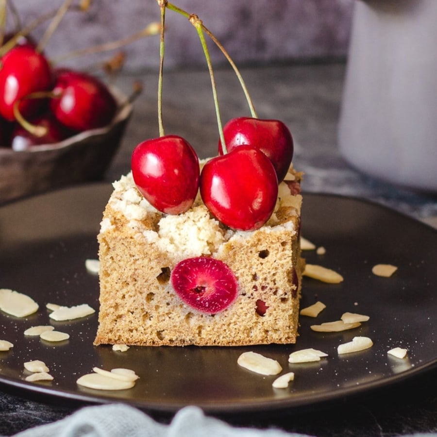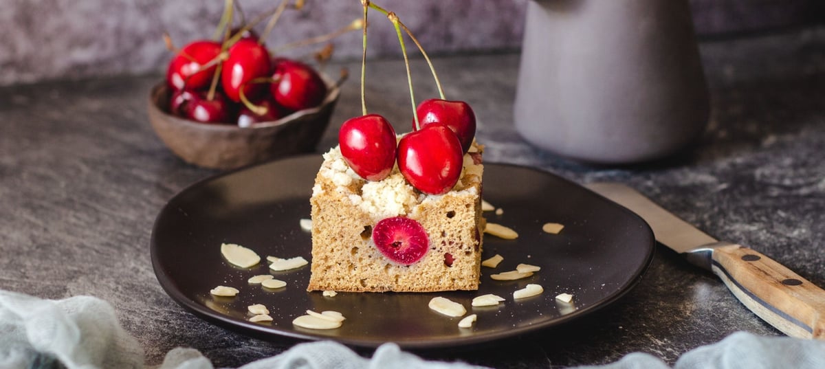 - 4Těsto nalijeme do pekáče o velikosti 20x30 centimetrů, poklademe třešněmi a posypeme drobenkou. Pečeme přibližně 30 minut. Upečení kontrolujeme zapíchnutím špejle do těsta. Pokud je špejle po vytažení suchá, piškot je upečený. Po upečení posypeme plátky mandlí.