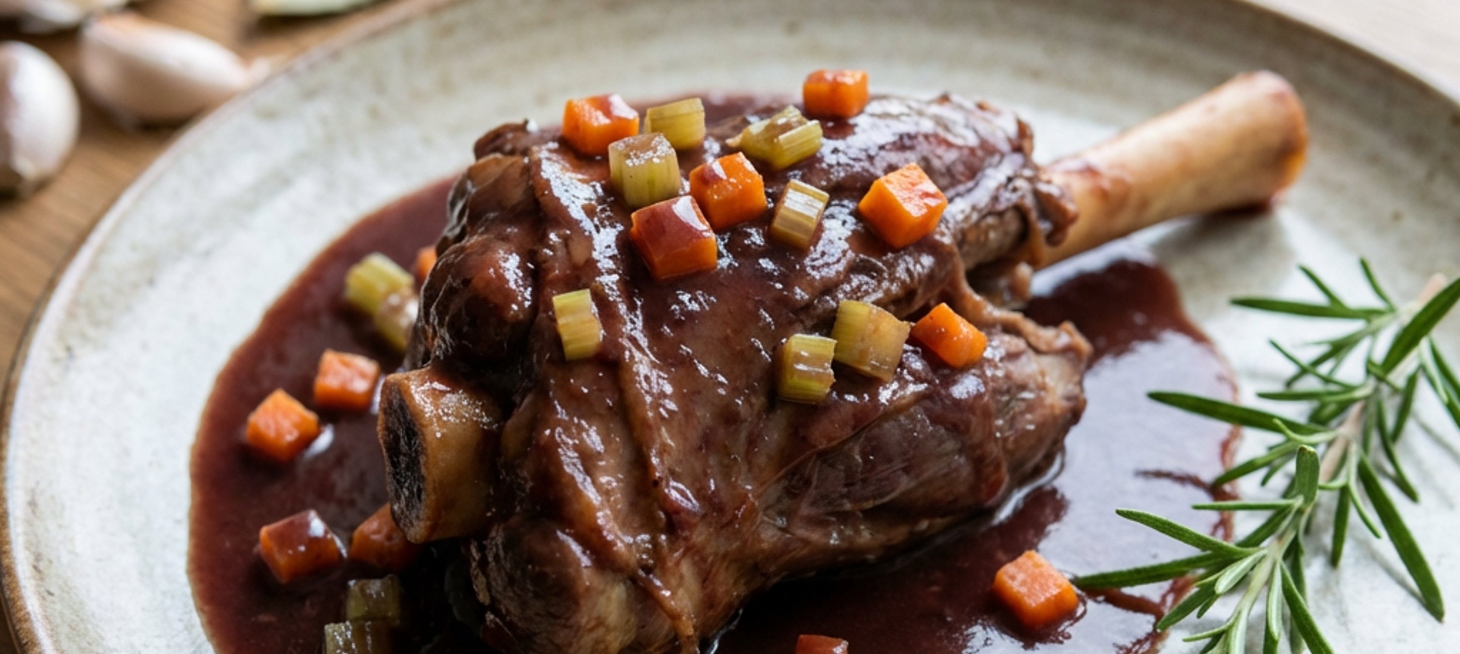 - 3V kastrolu na vyšším ohni rozpálíme olej. Kolena ze všech stran opečeme dozlatova a dáme stranou. Stáhneme oheň na polovinu, do kastrolu přidáme 60 g másla a cibuli a za častého míchání ji orestujeme dozlatova. Přidáme kuličky pepře, bobkové listy, protlak a rozmarýn a vše za stálého míchání 1 minutu restujeme. Přilijeme víno, přivedeme ho k varu, zamícháme, vložíme zpět kolena, oheň stáhneme na polovinu a víno odvaříme na polovinu původního objemu.