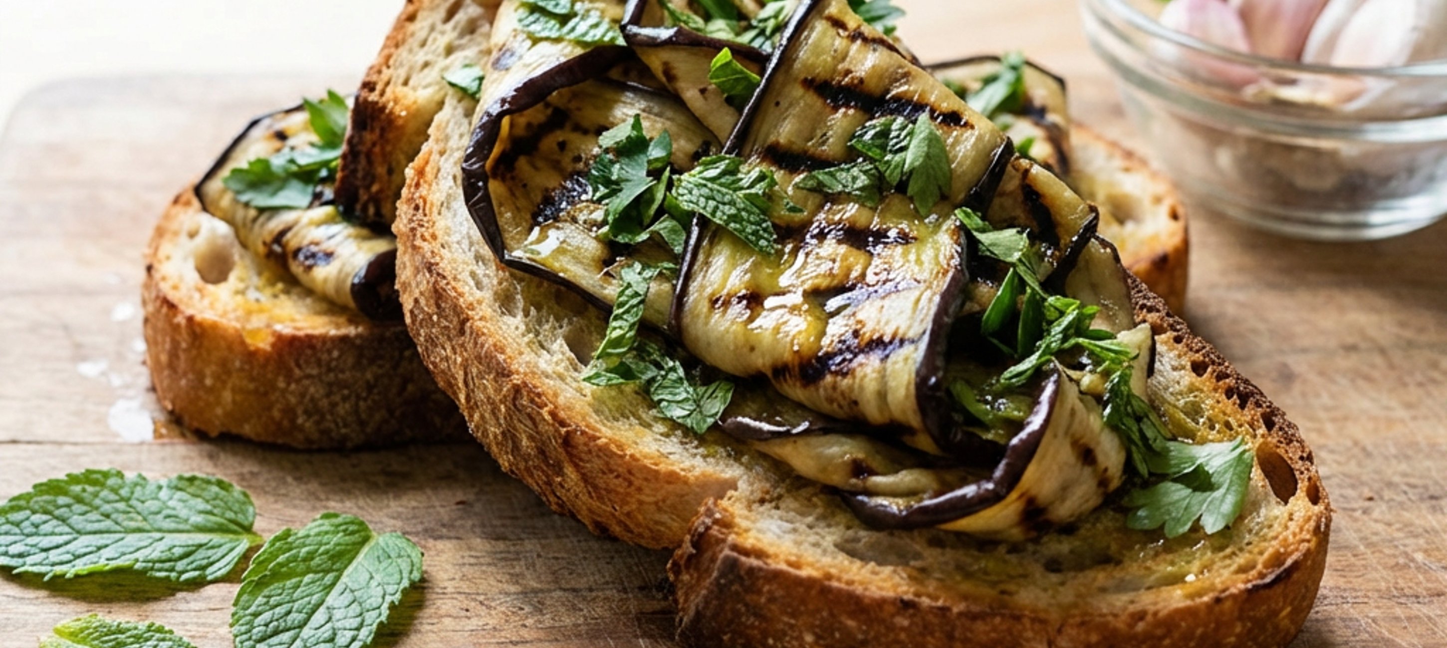 - 3Krajíce chleba přepůlíme a opečeme dokřupava v troubě, v toustovači nebo na grilu. Upečené chleby potřeme stroužkem česneku a zakápneme olivovým olejem. Podáváme s lilkovou směsí.