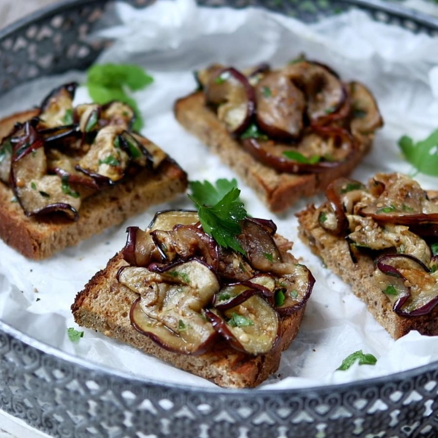 Halve the slices of bread and toast them until crispy in the oven, toaster, or on the grill. Rub the toasted bread with a clove of garlic and drizzle with olive oil. Serve with the eggplant mixture.