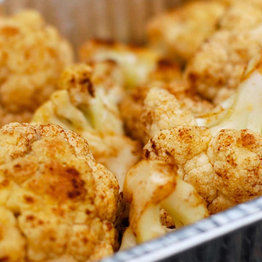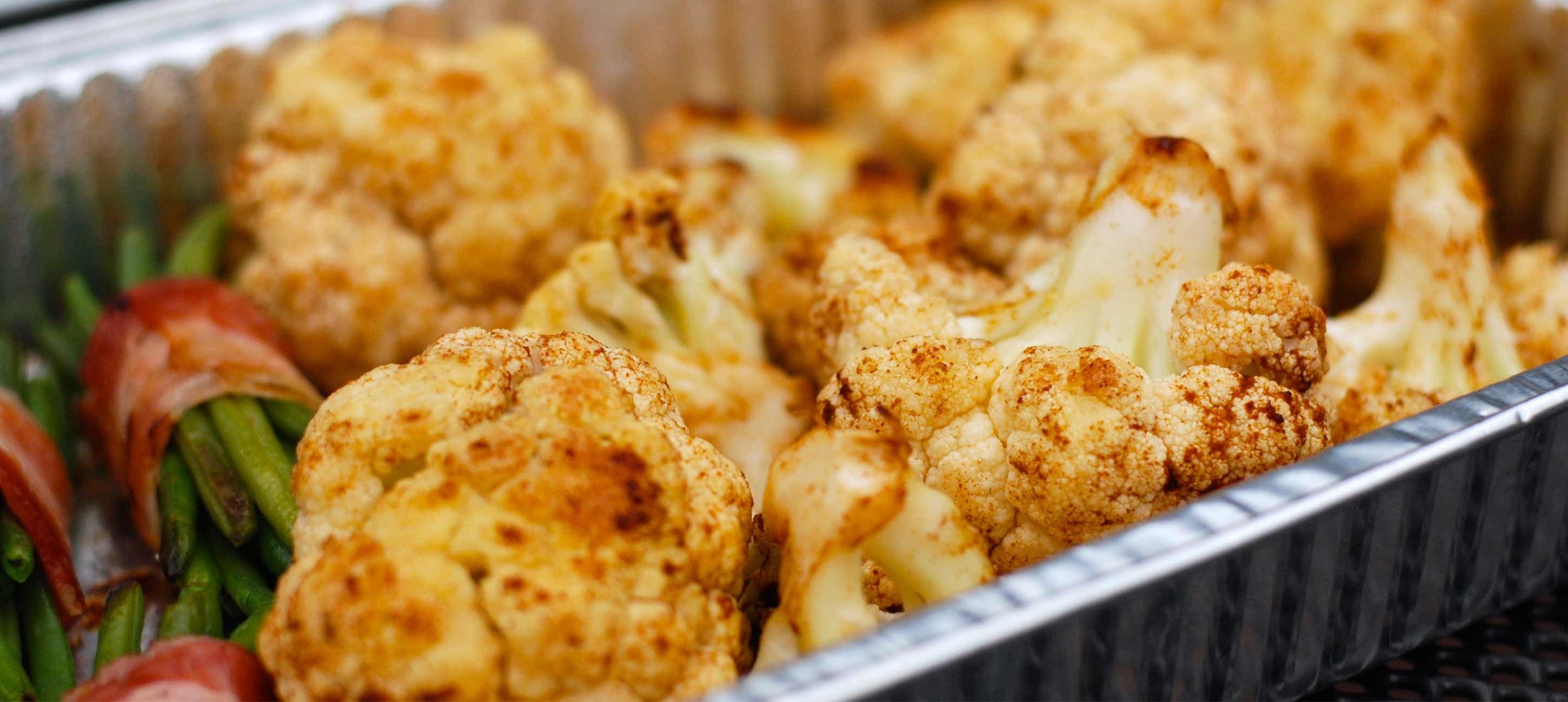 - 3Next, spread the cauliflower florets in a single layer in the aluminum grill tray, place on a hot grill, cover with a lid, and bake for 10-15 minutes, depending on how soft you like your cauliflower. Don't forget to occasionally turn or at least stir the cauliflower so that the bottom side comes up.