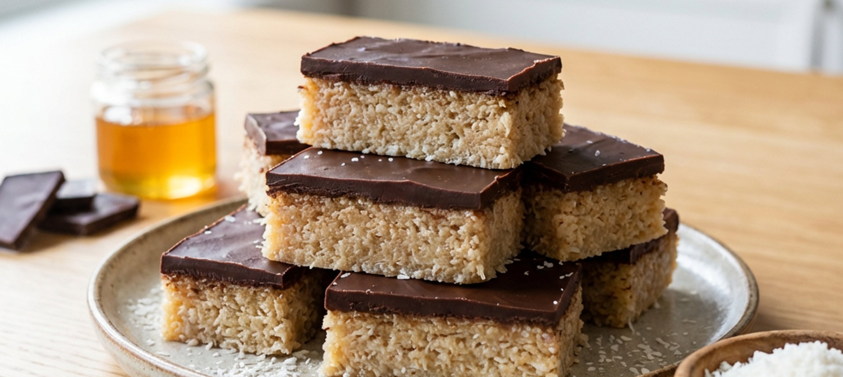 - 2Do misky nasypte strouhaný kokos a vanilkový extrakt. Přidejte med a rozpuštěný kokosový olej a důkladně promíchejte. Vzniklou směs navrstvěte do připravené obdélníkové nádoby nebo pekáče a dejte zatuhnout do mrazáku na 15–20 minut. Zhruba 5 minut před vyndáním ztuhlé směsi z mrazáku si rozpusťte čokoládu s kokosovým olejem nad vodní lázní.