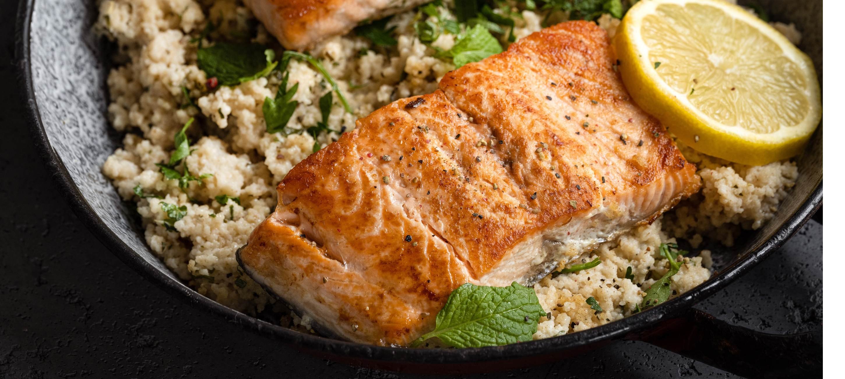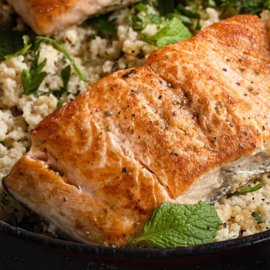 - 2Prepare the couscous according to the instructions on the package. Once it's ready, add mint, parsley, lemon zest and juice, basil, cream, salt, and pepper, mix well, and transfer the entire contents to the baking dish. Place the salmon fillets skin side up on the couscous, put the baking dish in the preheated oven, and bake everything for 15–17 minutes at 180–185 °C.