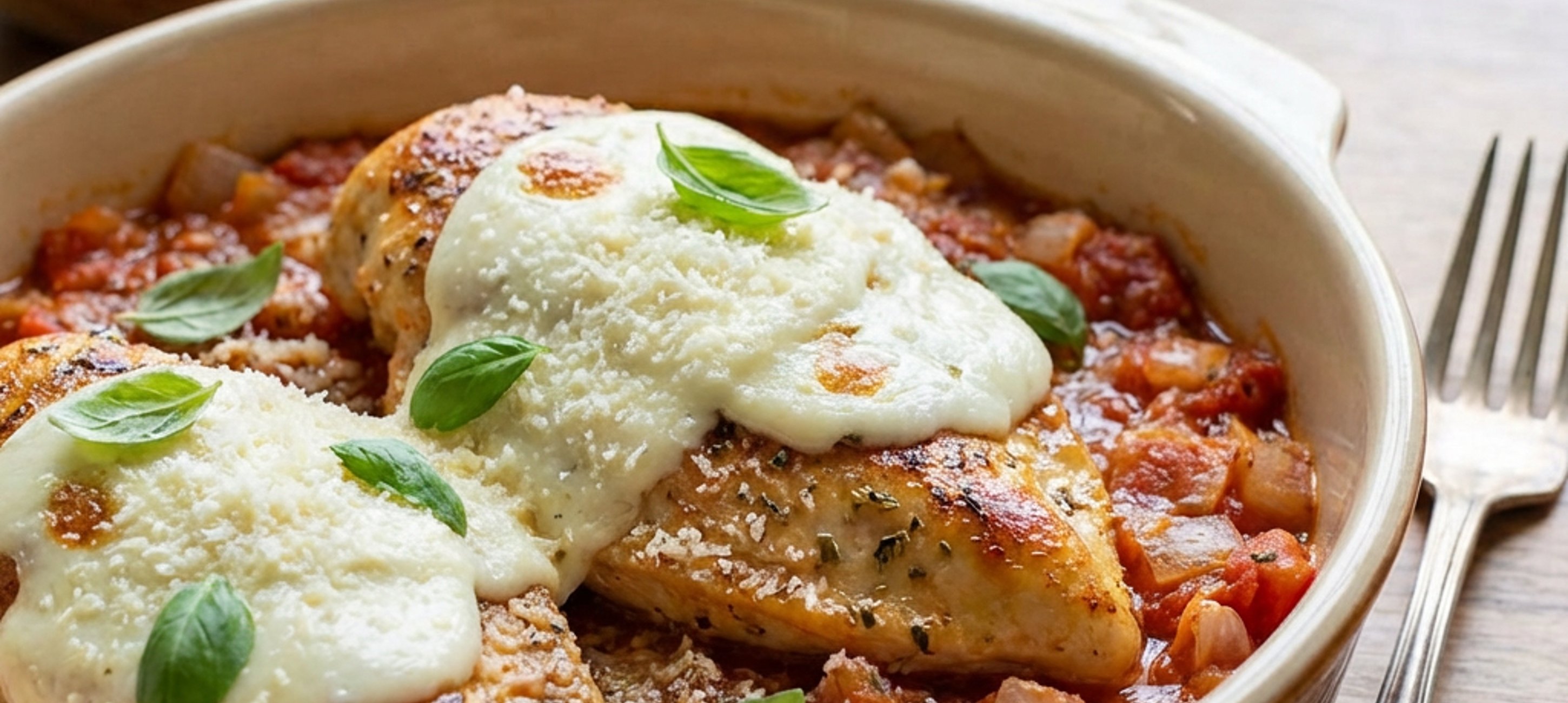 - 4Hotovou rajčatovou směs přemístěte do zapékací nádoby. Na směs položte opečená kuřecí prsa, přidejte plátky mozzarelly a vše posypte strouhaným parmazánem. Zapékací nádobu vložte do předehřáté trouby a pečte 13–15 minut při 200–210 °C.