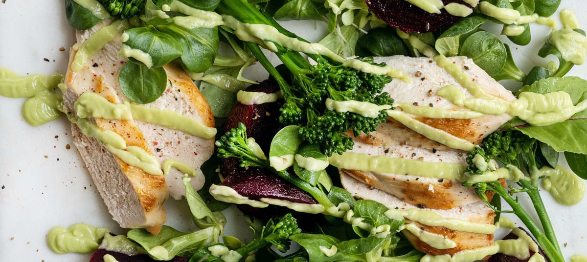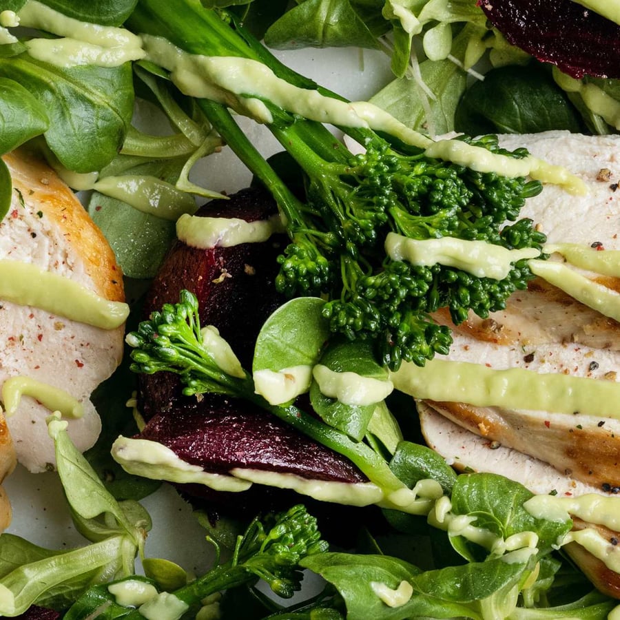 - 6Divide the fried chicken breasts onto 4 plates and serve with cooked broccoli and marinated beetroot. Garnish each portion with fresh basil leaves and serve with avocado pesto.