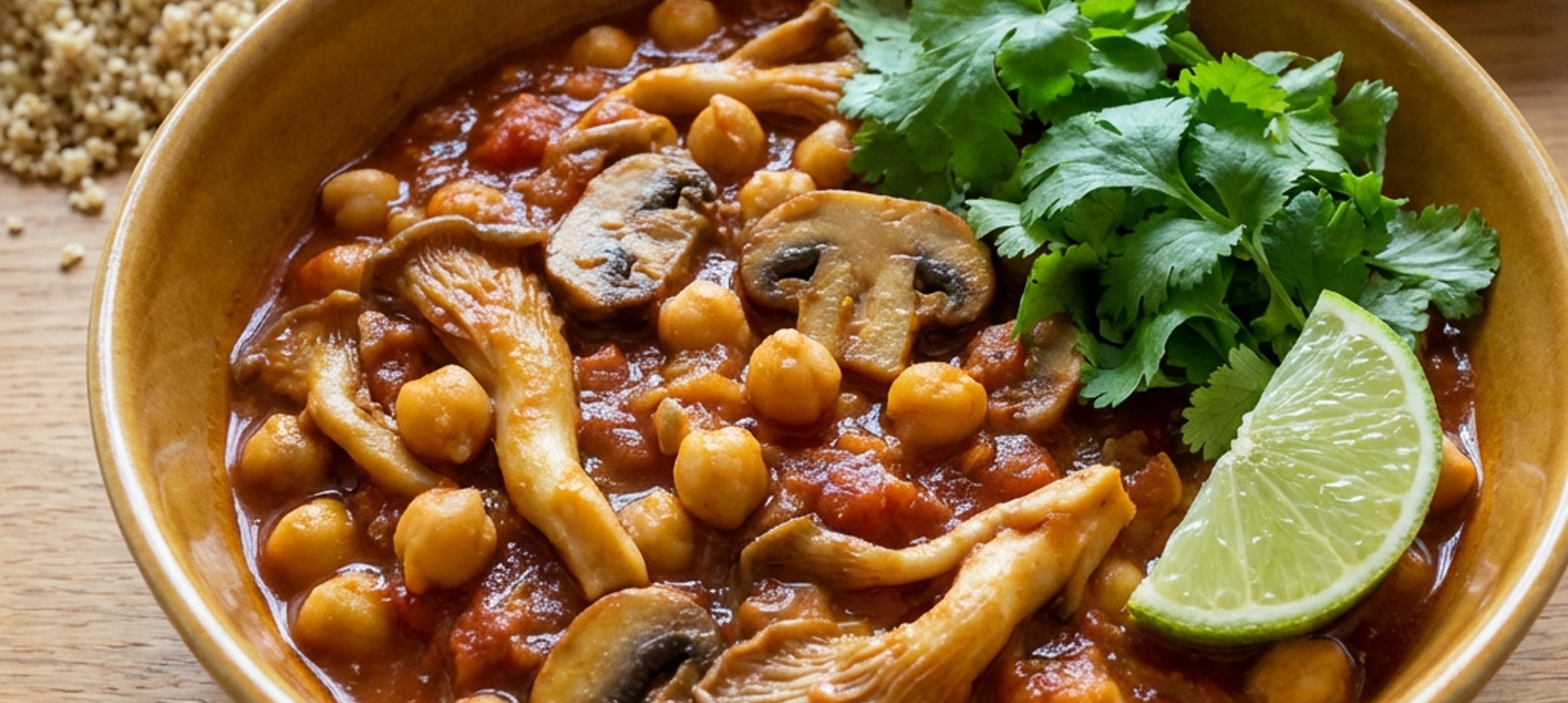 - 3Poté sceďte cizrnu a společně s rajčaty, meruňkami, římským kmínem, solí a pepřem ji přidejte k orestovaným houbám. Následně snižte plamen na mírný stupeň, pánev přiklopte pokličkou a vše duste 8–10 minut.