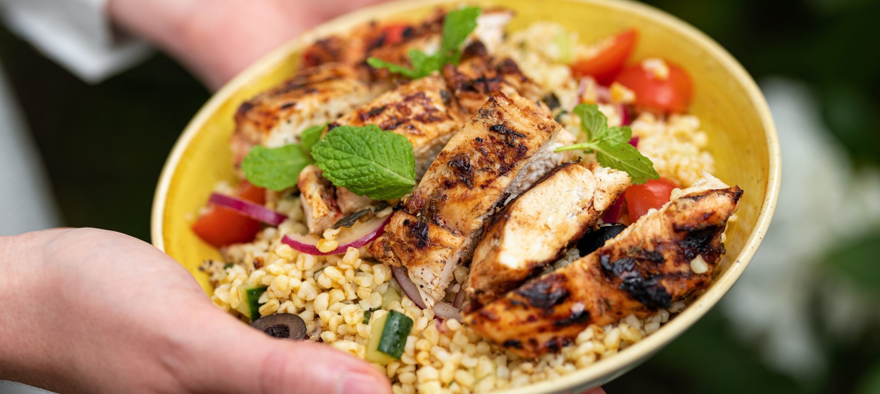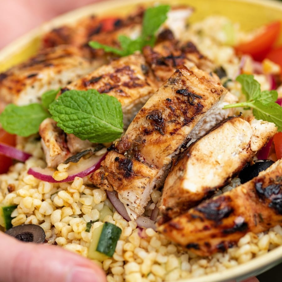 - 6Once the chicken is marinated, heat up the grill. Then place the chicken breasts on it and grill them quickly for 6–7 minutes on each side. Then move the meat to the edge of the grill, where the heat is not intense, and finish cooking for 4–5 minutes.