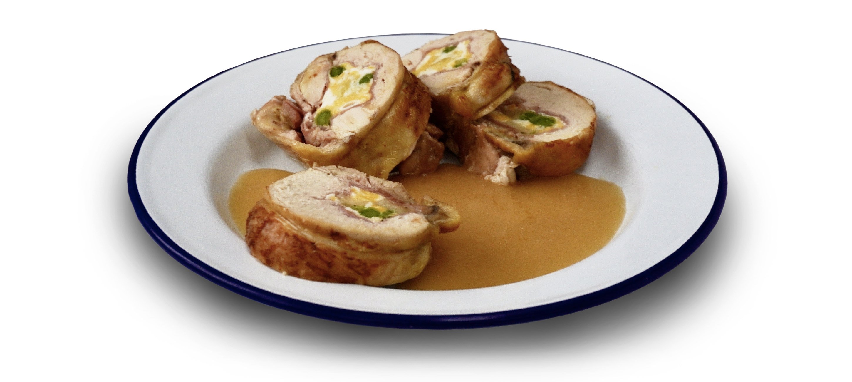 If you start making broth from the bones of the deboned chicken while the roulade is baking, use this emerging broth both for basting the chicken in the oven and for adding liquid to the sauce in the saucepan. The difference is immense.