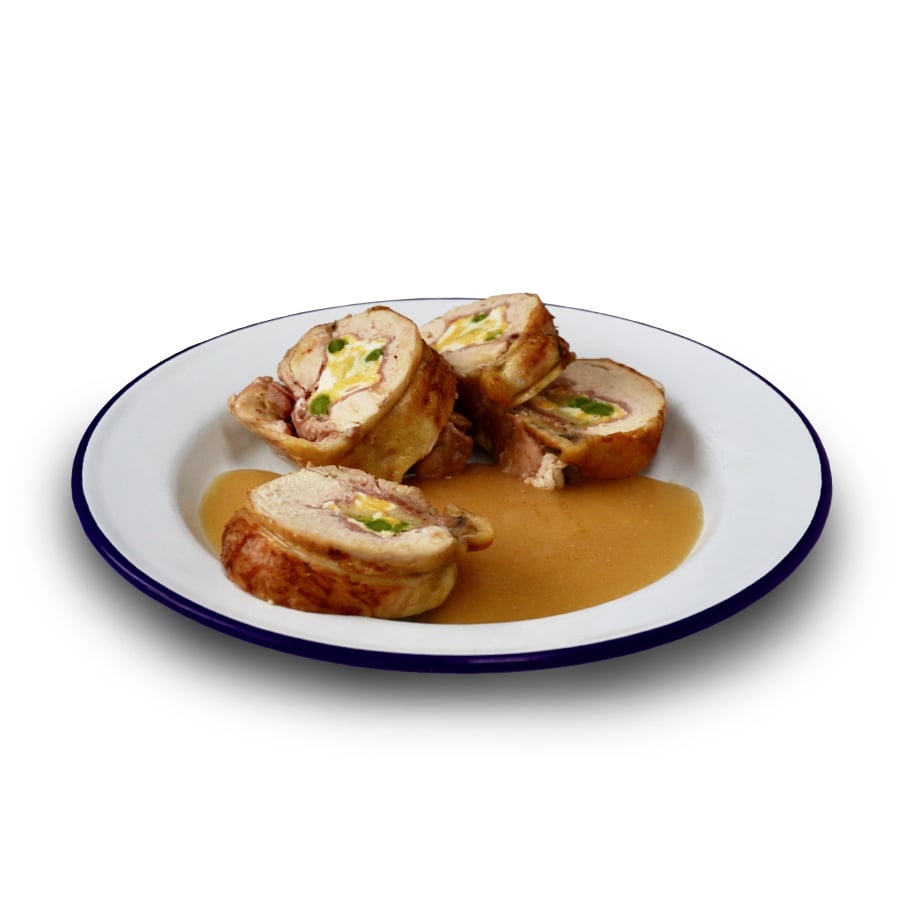 - 7Remove the baked roulade from the oven along with the baking dish. Transfer the roulade to a plate or cutting board and strain the drippings over the roux. Stir thoroughly immediately. If you end up with something between putty and glue, it means there was too little liquid in the baking dish, so add 100-150 ml of water to the saucepan, which should create a consistency much closer to a sauce. Let it simmer gently for at least 15 minutes (20 is better), stirring occasionally and adding a splash of evaporated water if necessary. To prevent the chicken roulade from cooling in the meantime, return it to the empty baking dish and place it in the turned-off oven, where it will finish cooking and become tender.