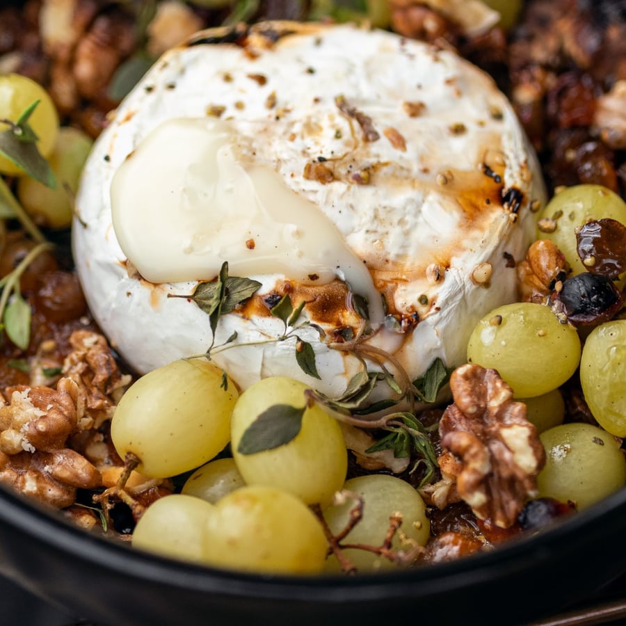 - 2Place the Hermelín in the center of each square of aluminum foil and drizzle each piece with honey. Add halved grapes, raisins, coarsely chopped walnuts, dried thyme on top, and wrap everything up.