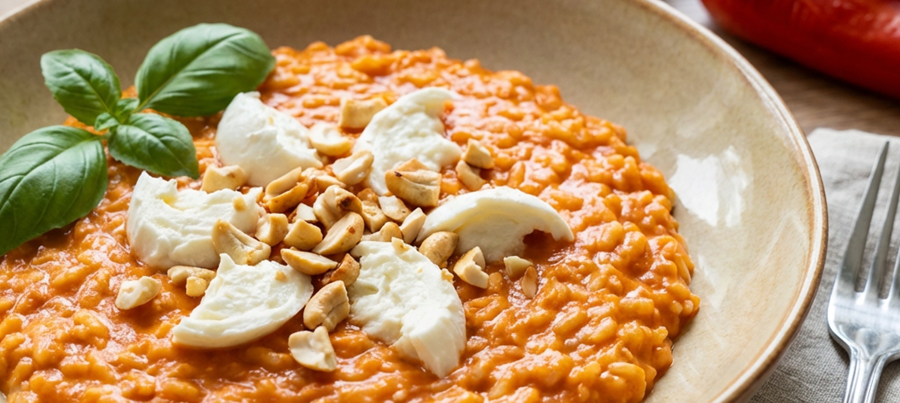 - 7K rýži přidejte sůl a pepř a vařte do změknutí, až bude rýže takzvaně na skus. Ve chvíli, kdy je rýže uvařená na skus, přidejte do ni máslo a nakrájené papriky nebo paprikové pyré.