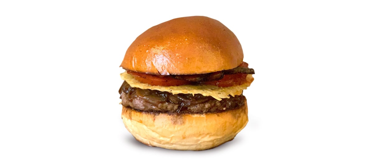 - 7When the meat is done, spread ketchup on both sides of the brioche, place the meat on the bottom, add caramelized onion on the meat, a slice of Parmesan chips on top, followed by tomato with mushrooms. Finally, cover with the top half of the brioche and serve.