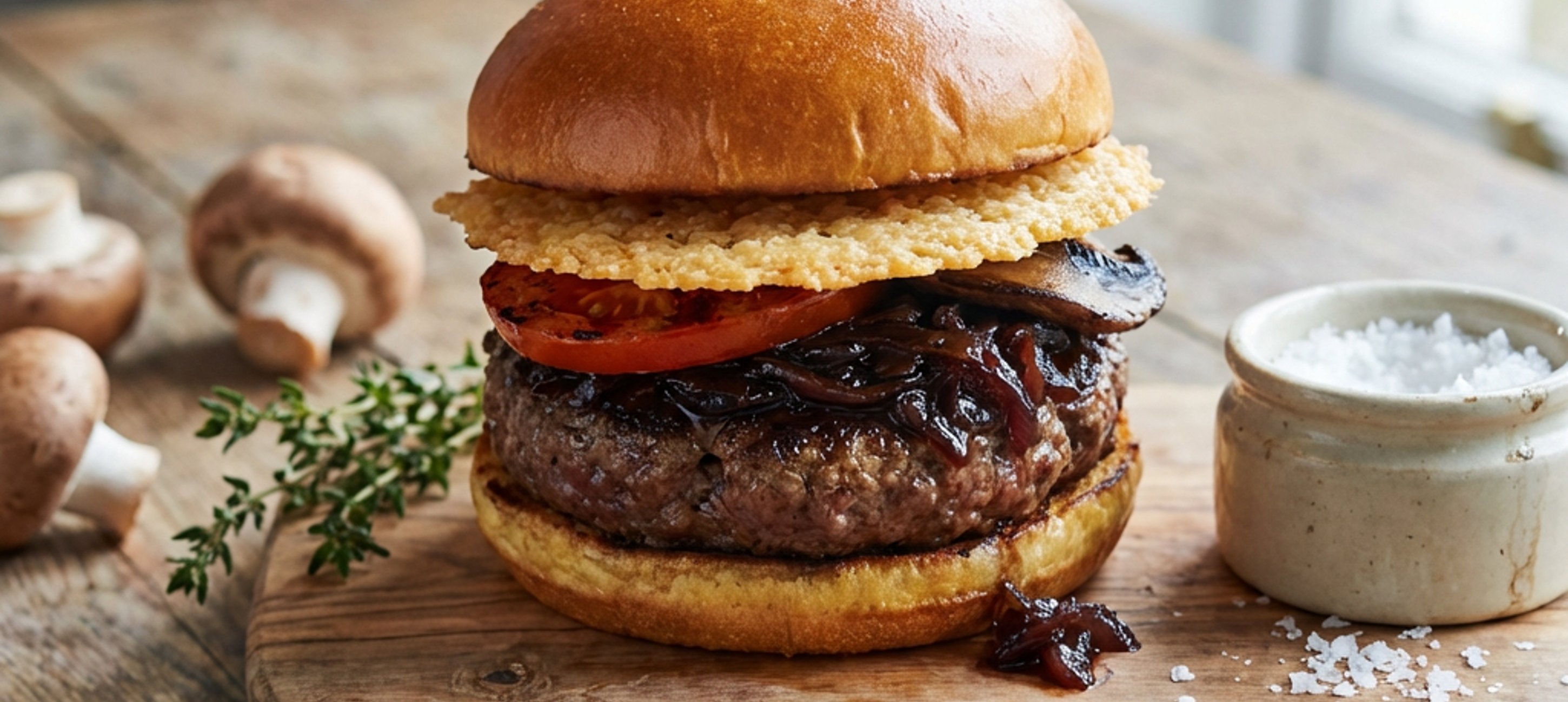 - 7Když je maso hotové, obě strany briošky potřeme kečupem, na spodní vložíme maso, na maso zkaramelizovanou cibulku, na ní kolečko parmezánového chipsu, na který přijde rajče s žampiony. Nakonec přiklopíme vrchní stranou briošky a můžeme podávat.