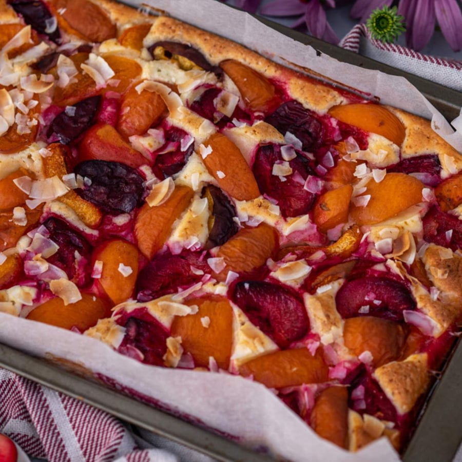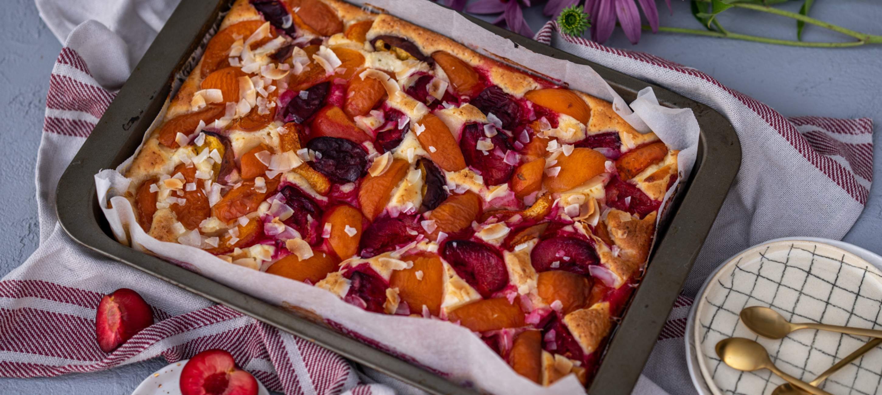 Bake at 160 degrees Celsius (fan) for about 40 – 50 minutes (the time depends on the size of the baking sheet and the juiciness of the fruit). A skewer test will help at the end.