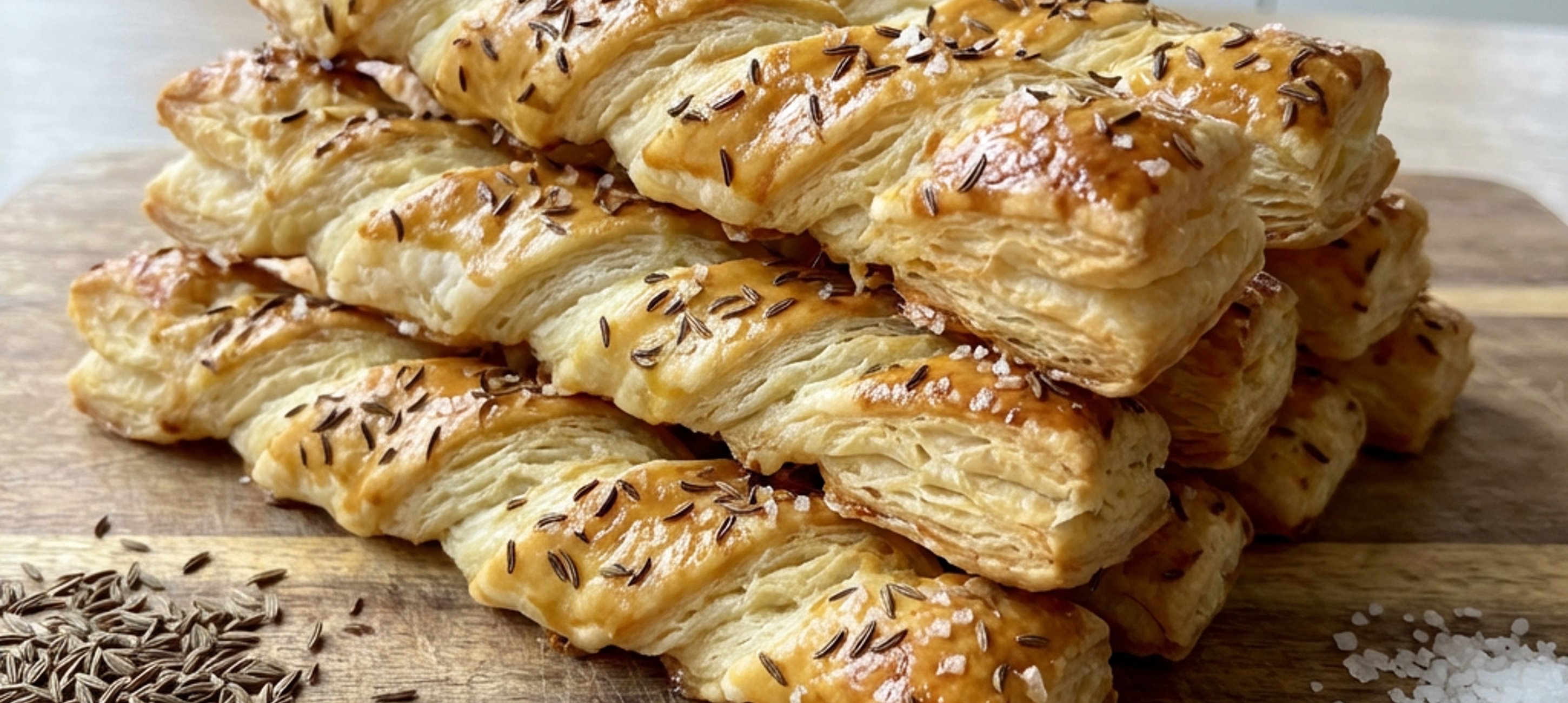 - 3Jednu placku posypeme solí a kmínem, přikryjeme ji druhou plackou potřenou stranou dolů a jemně je stlačíme k sobě. Spojené placky nařežeme na proužky široké 1 cm, stočíme je do vrtule, položíme na plech vyložený pečicím papírem a pečeme v rozehřáté troubě 15–20 minut dozlatova.