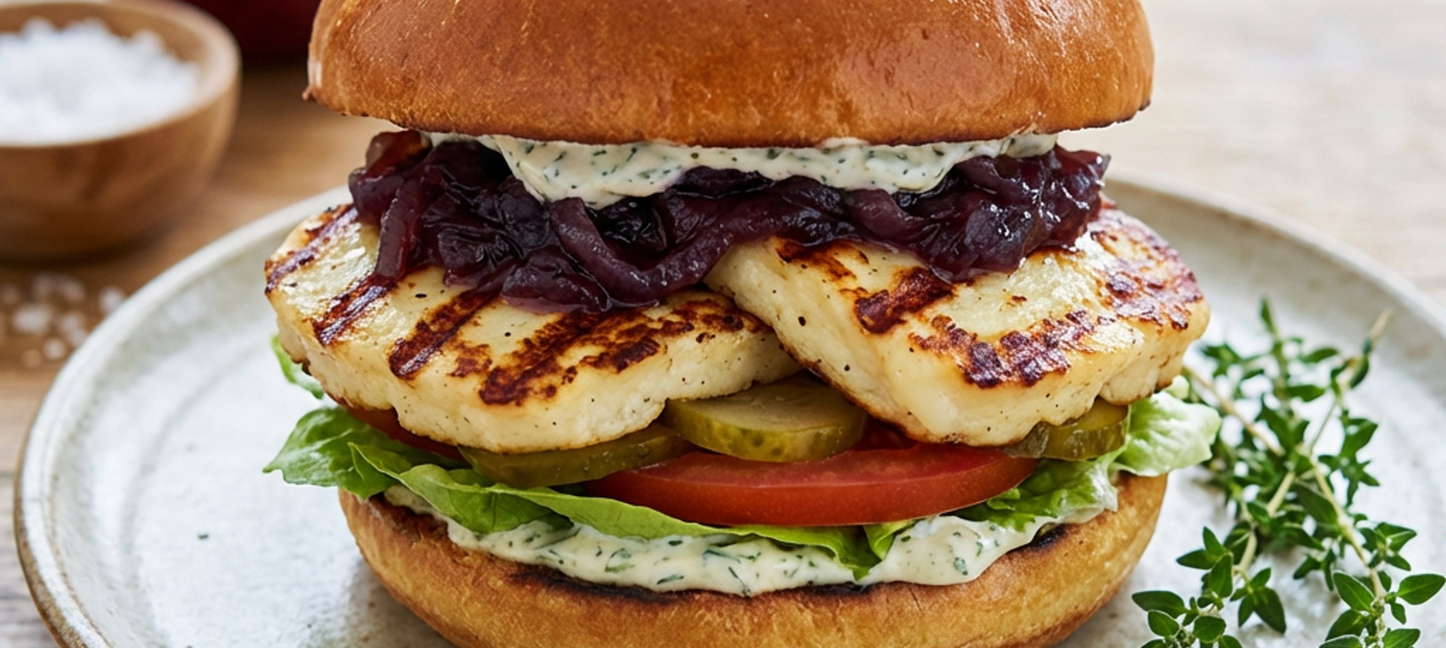 - 3Spodní díl bulky potřete připraveným dipem, položte na ni plátek salátu, na něj navrstvěte grilovaný sýr halloumi, přidejte plátek rajčete a pár koleček kyselé okurky. Navrch přidejte cibulové chutney. Vrchní díl bulky taktéž potřete dipem a burger s ním zakryjete.