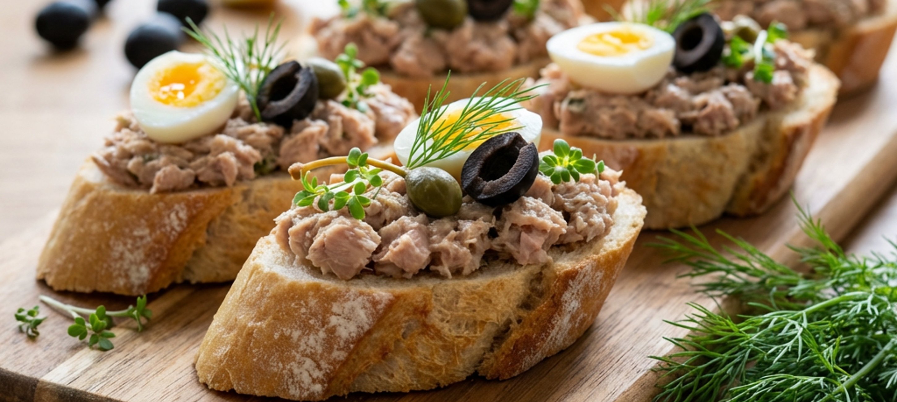 - 6Na plátek bagety dáme list římského salátu, navrstvíme cca 40 g pomazánky z tuňáka a ozdobíme krájenými olivami, kapary, křepelčími vajíčky, řeřichou a snítkou čerstvého kopru.