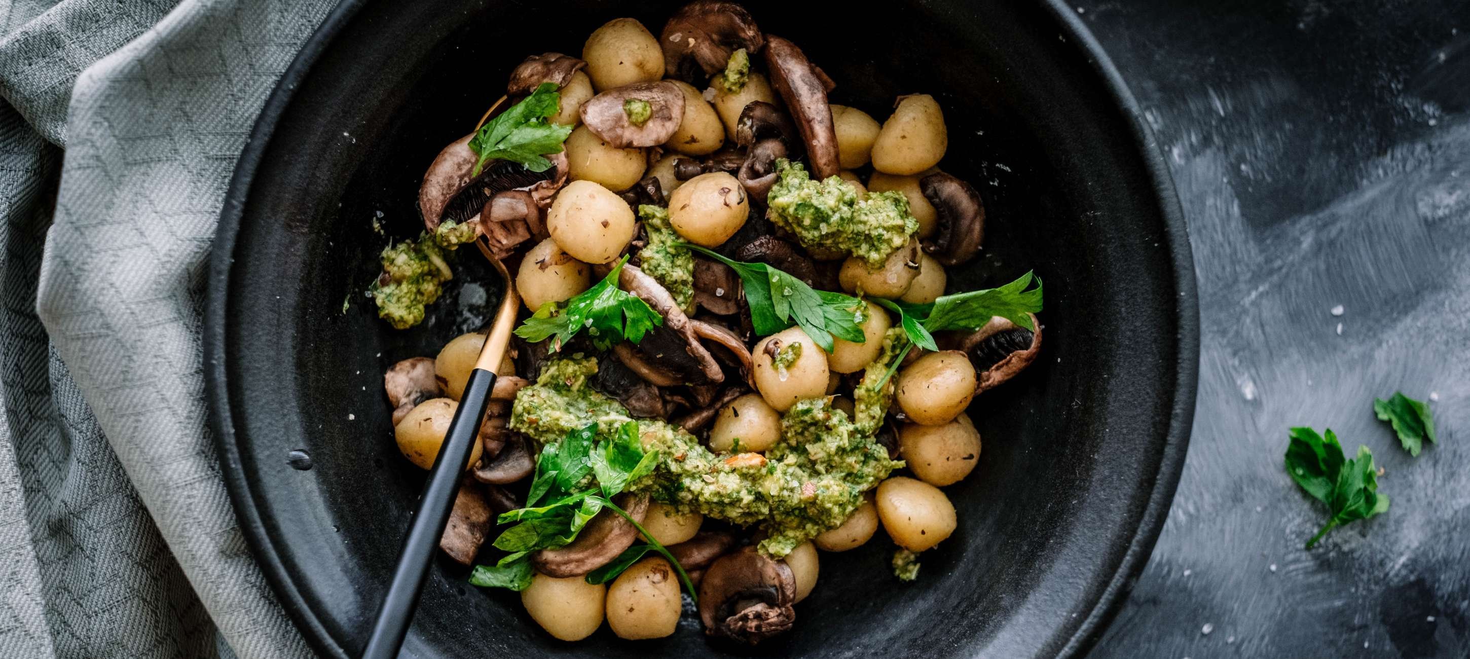 - 6Drain the cooked gnocchi and then immediately mix them in the pan with the mushrooms.