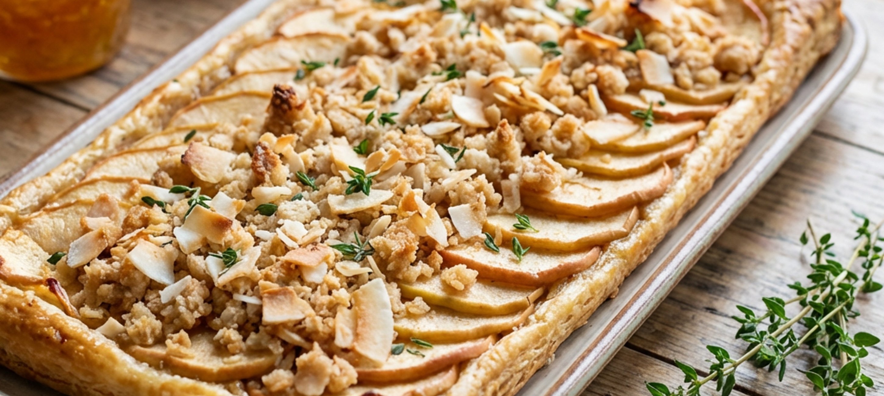 - 1Během chlazení těsta si připravíme náplň. Jablka oloupeme, rozkrojíme na čtvrtky a zbavíme jádřinců. Nastrouháme je na plátky a promícháme s cukrem a tymiánem.