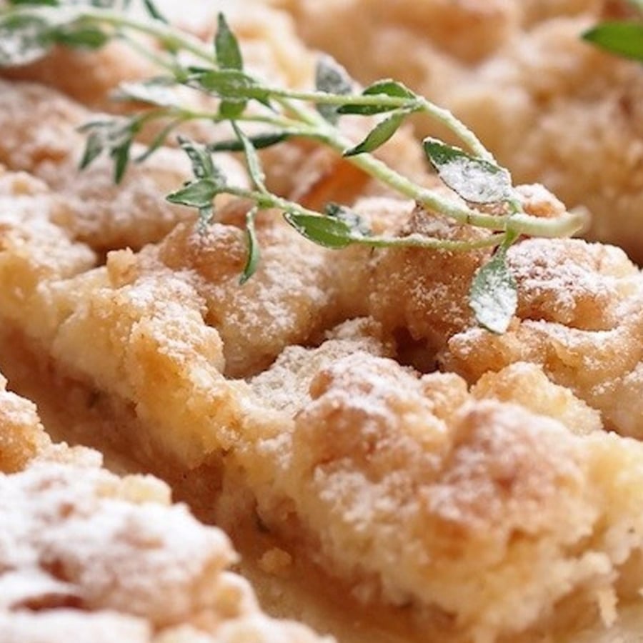 - 1While the dough is chilling, prepare the filling. Peel the apples, cut them into quarters, and remove the cores. Grate them into slices and mix with sugar and thyme.
