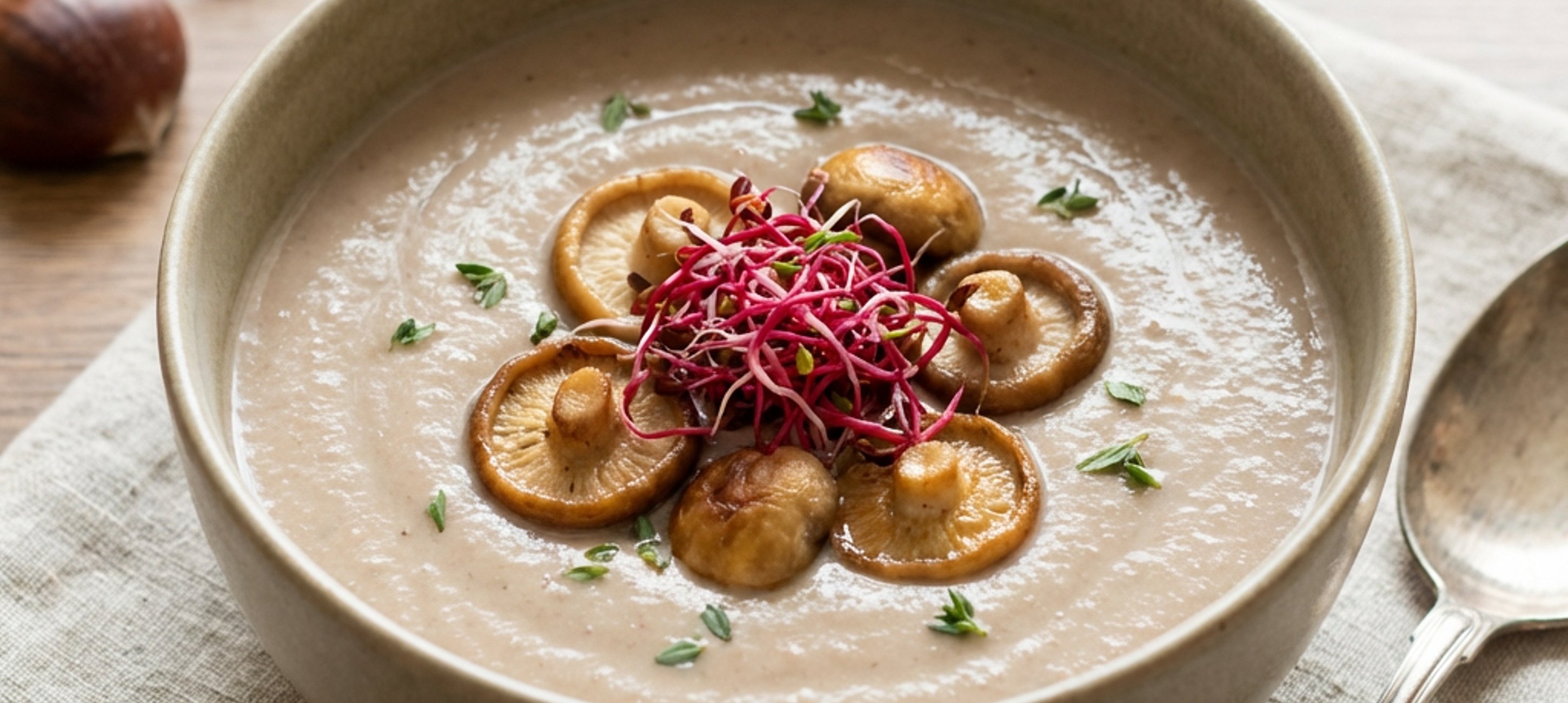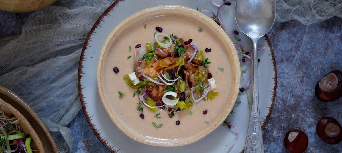 - 1Pórek očistíme a nakrájíme na kolečka. V hrnci rozpustíme 2 lžíce másla a orestujeme na něm pórek. Přidáme celé snítky tymiánu a rozmačkaný česnek, krátce zarestujeme. Dále přidáme kaštany a zalijeme vývarem. Společně vaříme na velmi mírném plamenu 30 minut. Použijeme pokličku, aby se nám tekutina příliš nevyvařila.