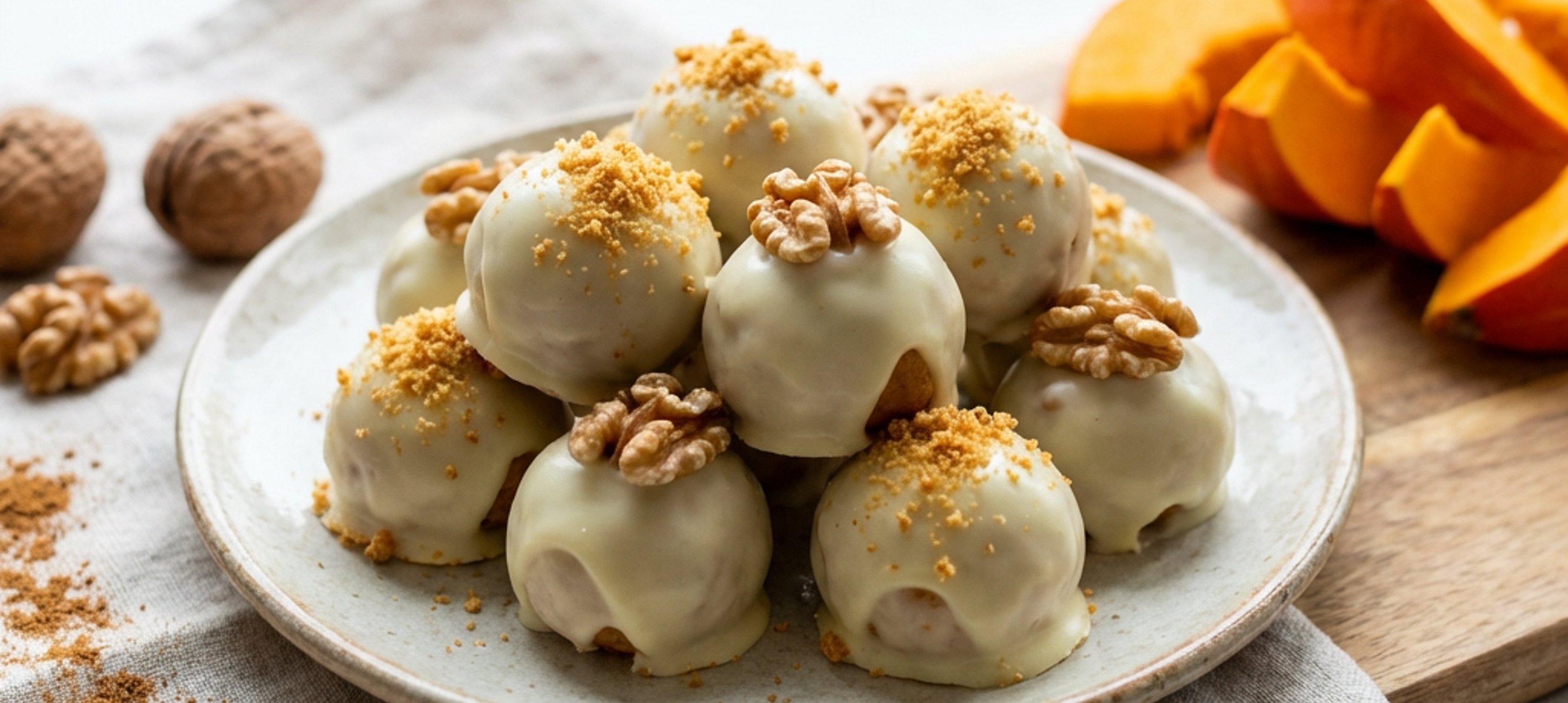 - 2Vyndejte kuličky z mrazáku a pomocí vidličky, na kterou kuličku vždy položíte, ponořte do polevy, nechte nad miskou trochu okapat a otřete stékající polevu (spodní část vidličky) o hranu misky. Položte na pečící papír, posypejte trochou sušenkového prachu nebo dozdobte oříškem. Nechte v lednici ztuhnout.